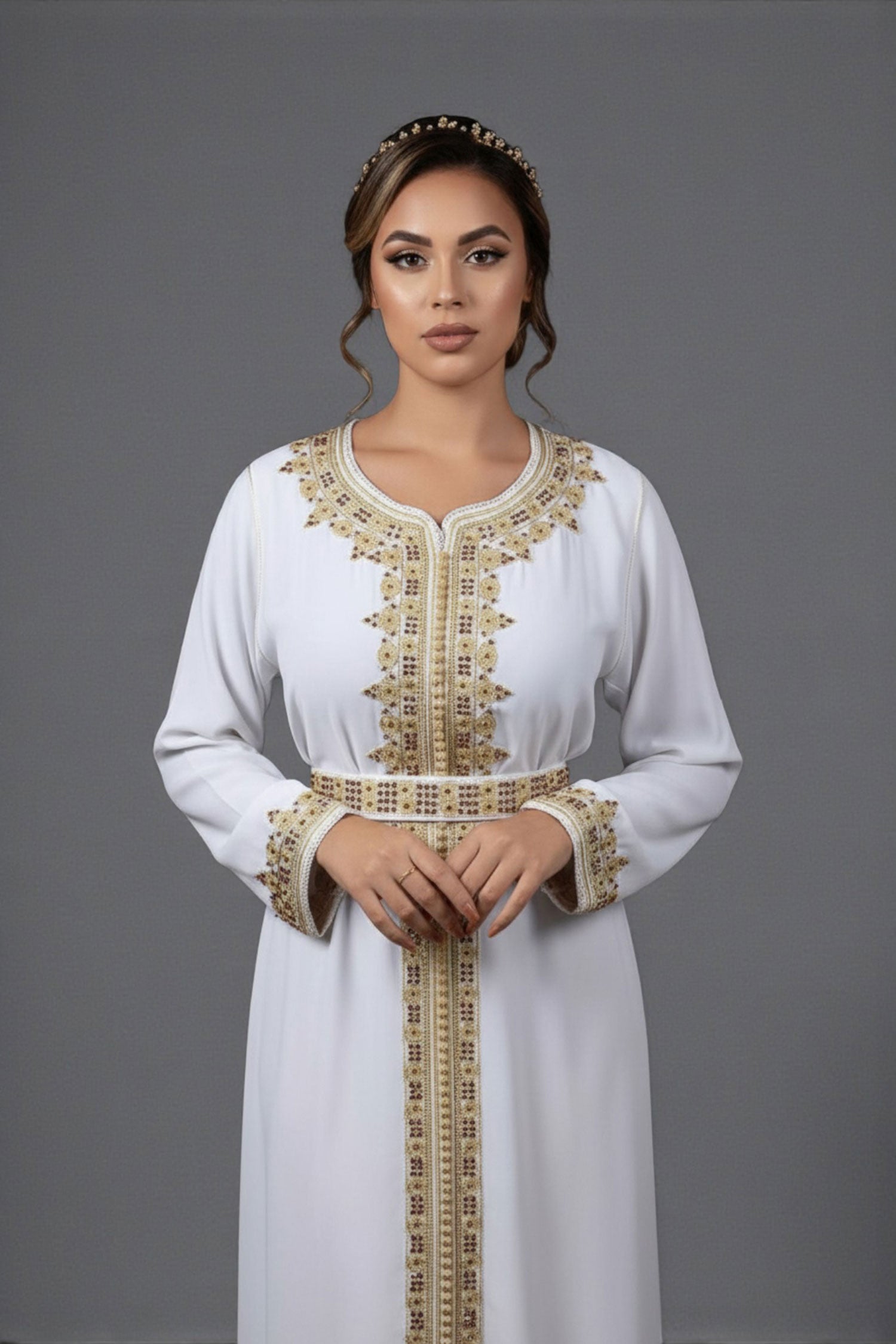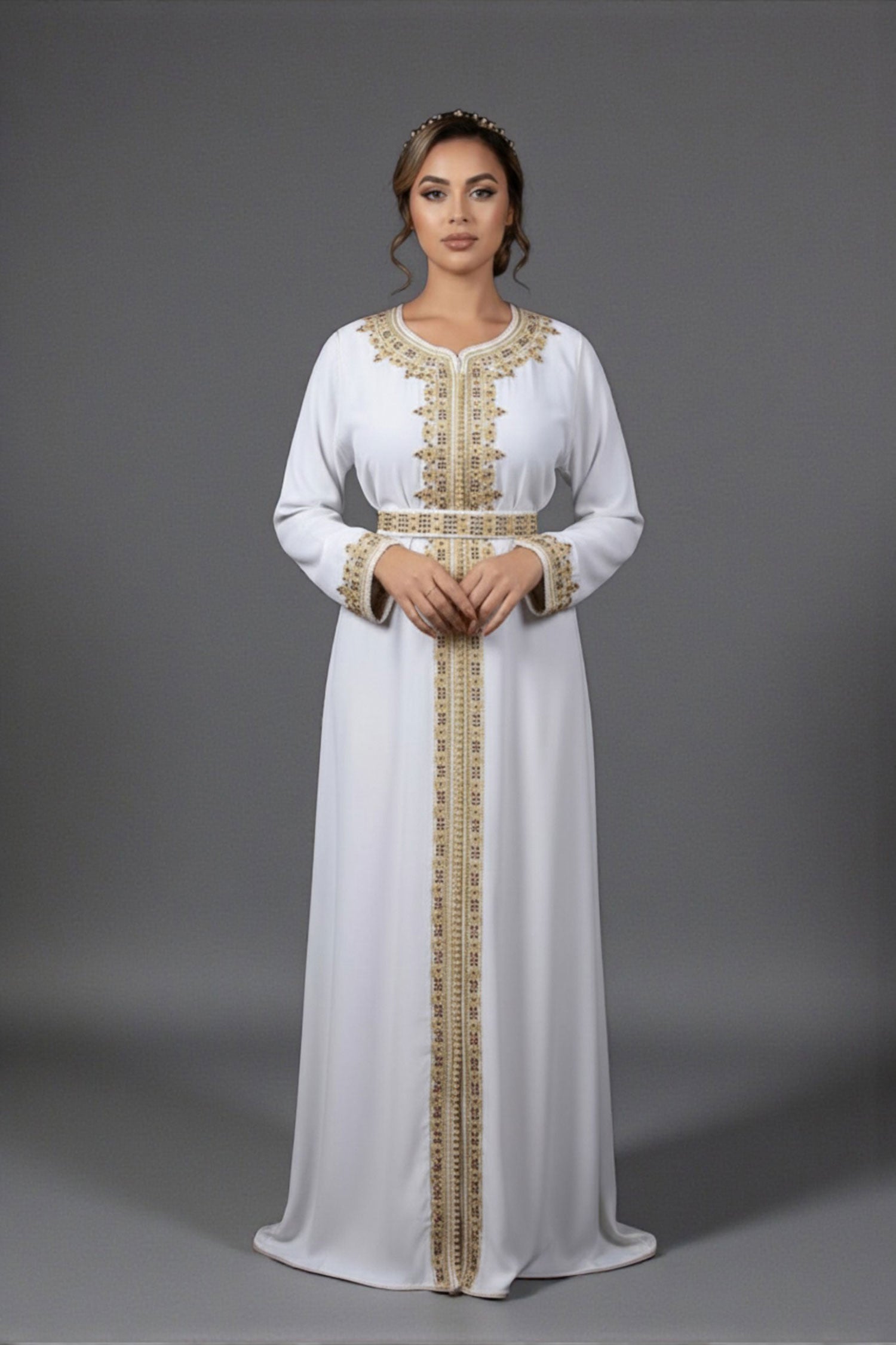 Choose this White and Gold Moroccan Caftan for special occasions where elegance and tradition meet harmoniously.