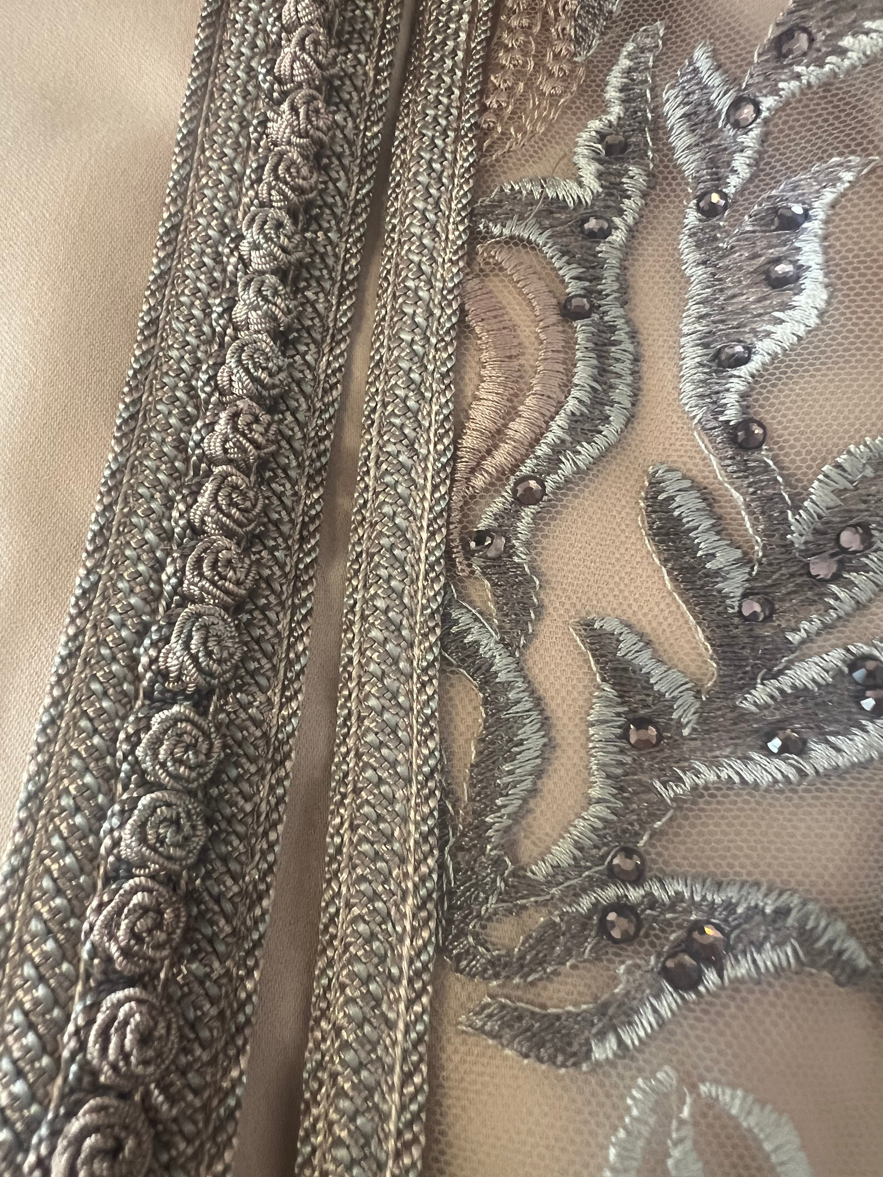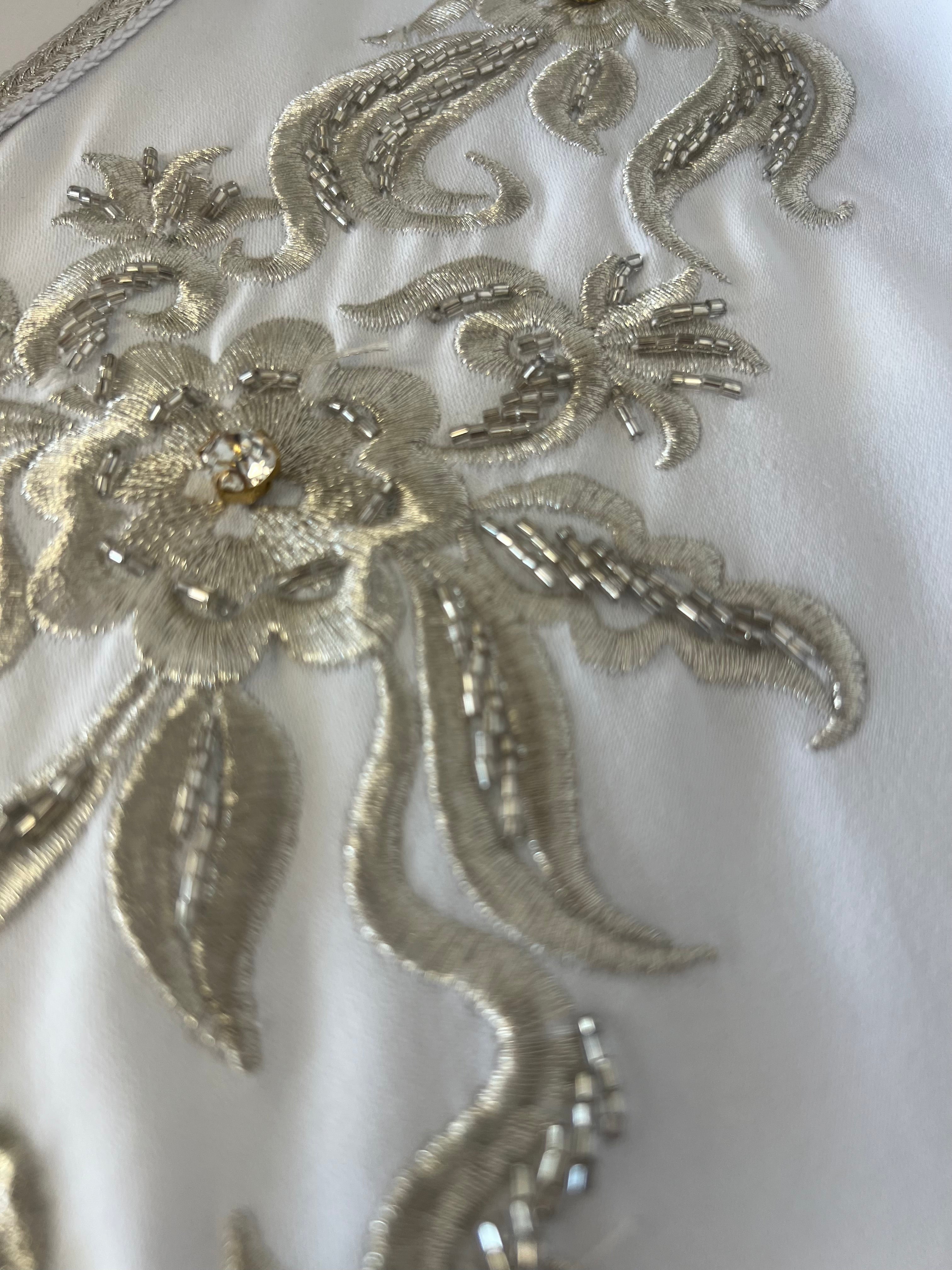 Dans le respect des traditions, des broderies sont magnifiées par l’ajout de perles cousues une à une à la main, révélant tout le soin, la précision et la passion de nos artisans pour un rendu exceptionnel.