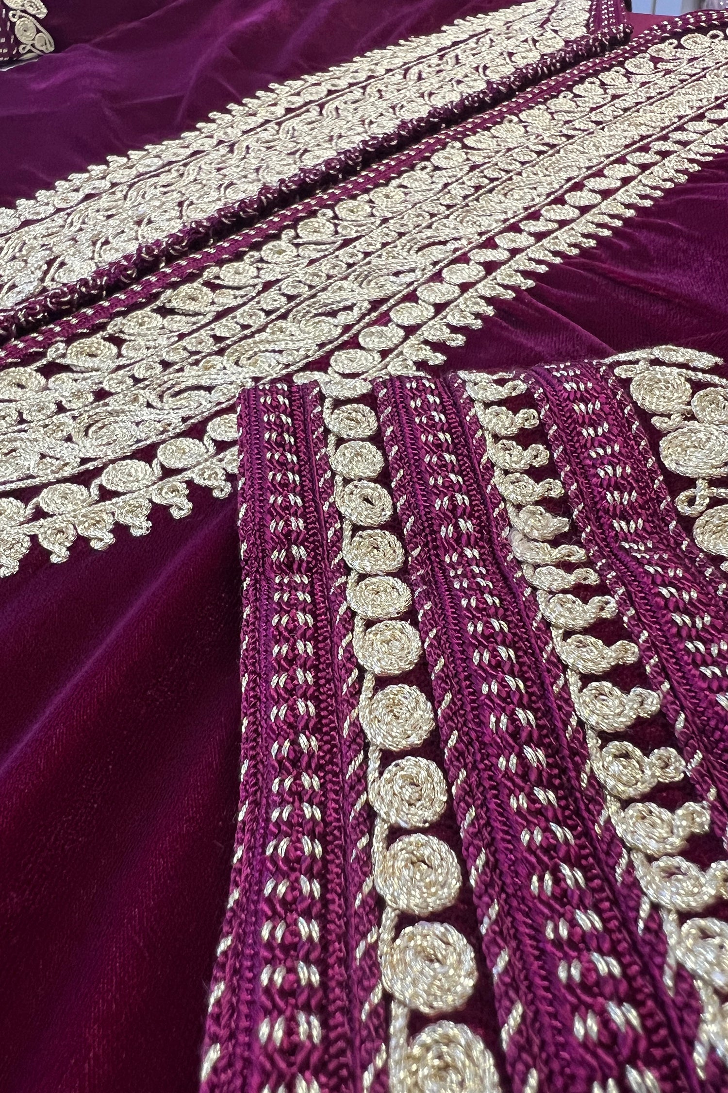 Le caftan marocain se distingue par la sfifa, élément emblématique qui orne ses bordures. Véritable signature artisanale, elle confère au caftan son caractère unique et raffiné.