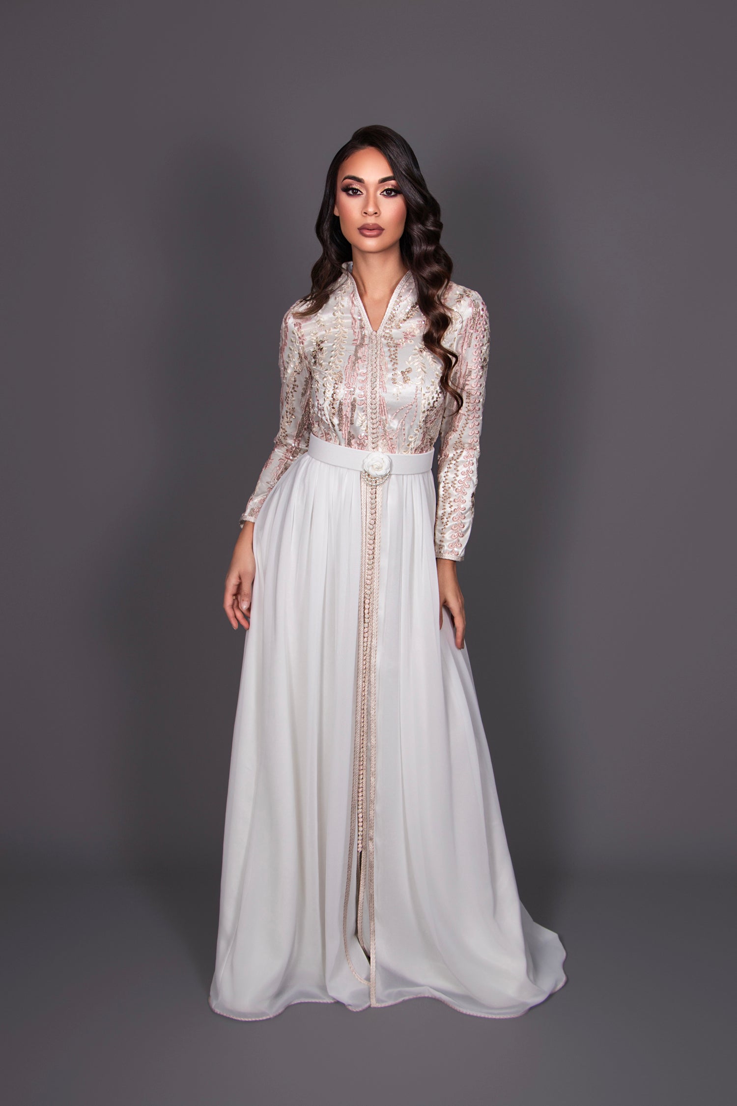 Caftan à coupe ajustée avec col montant, subtilement rehaussé d’une touche de rose.