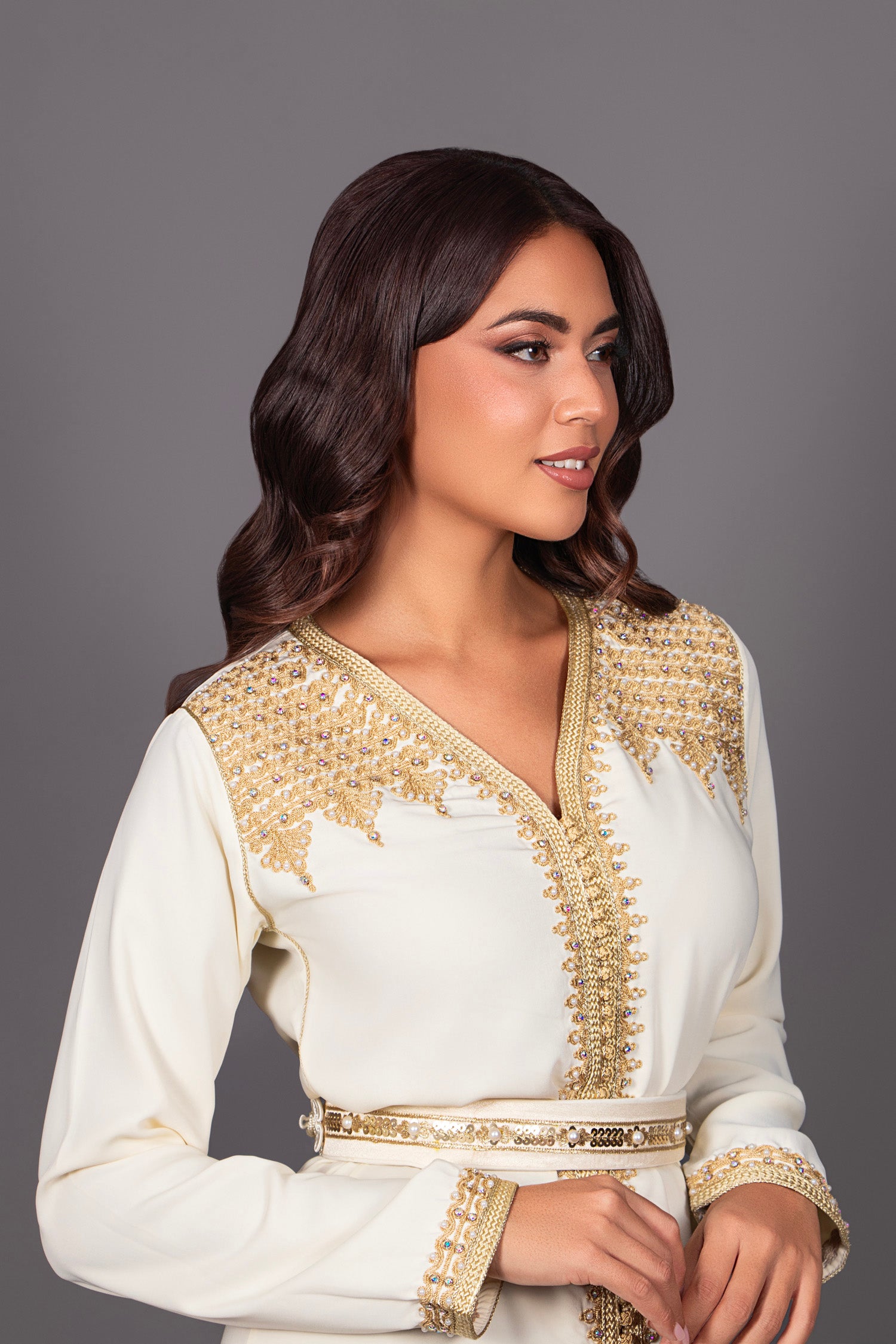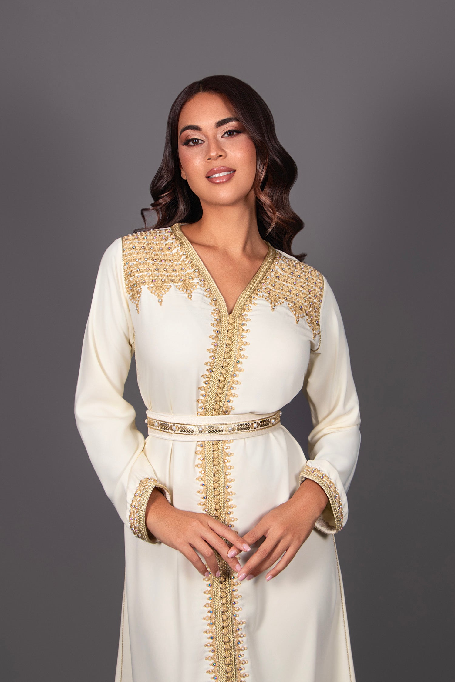 Ce caftan élégant une pièce est conçu dans une somptueuse teinte vanille-crème, orné de broderies dorées luxueuses et de détails perlés subtils. Sa coupe fluide et majestueuse est accentuée par une ceinture assortie qui affine la silhouette. Idéal pour des occasions spéciales, il allie tradition marocaine et modernité avec raffinement.