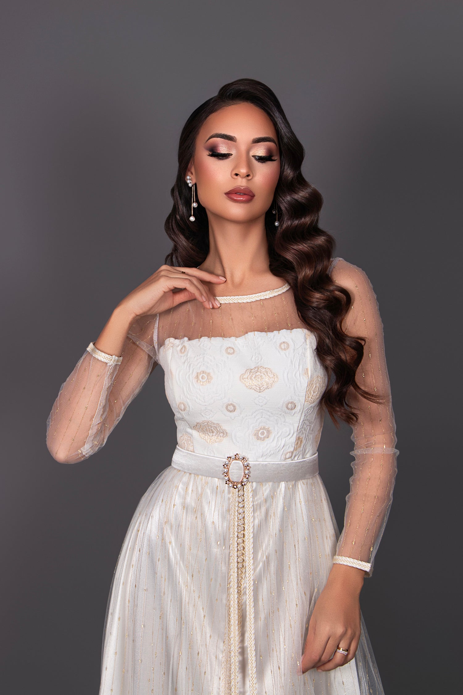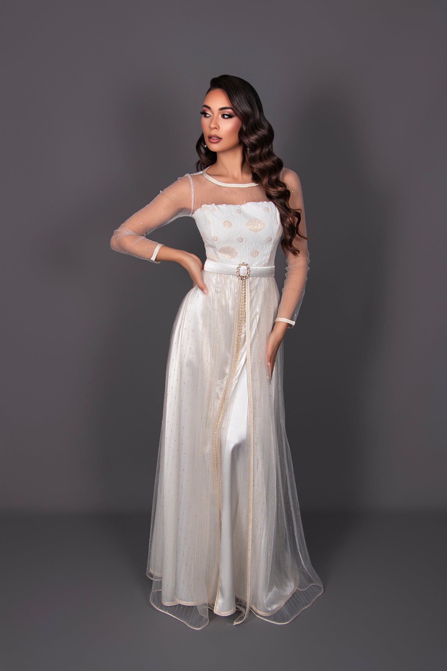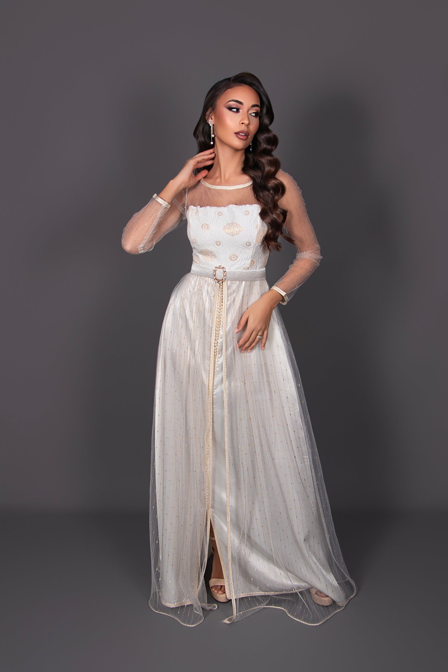 Caftan en brocard et tulle avec élégants jeux de transparence, parfait pour un mariage raffiné à petit budget.