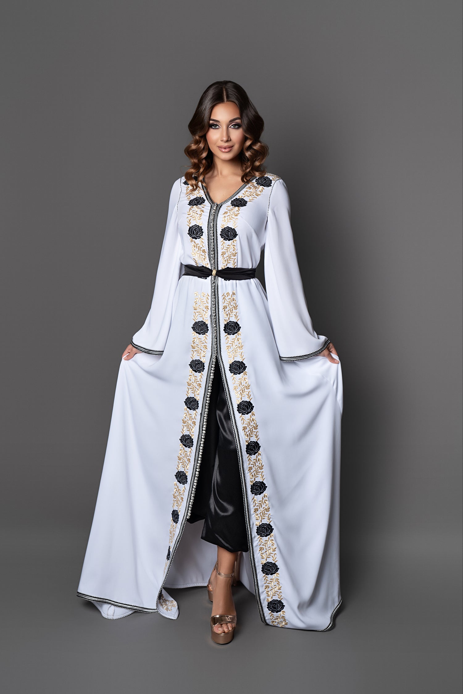 Caftan en crêpe brodé d'or et de noir