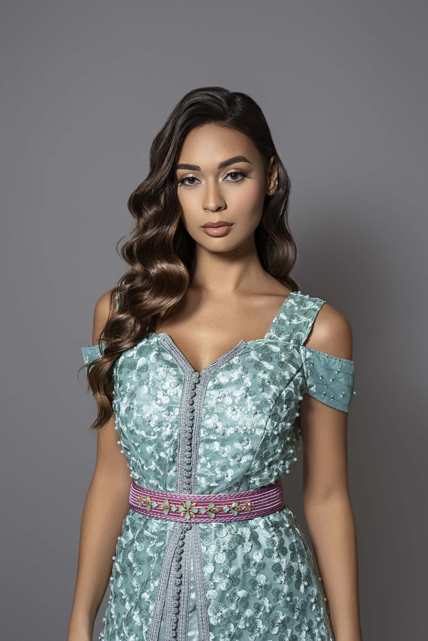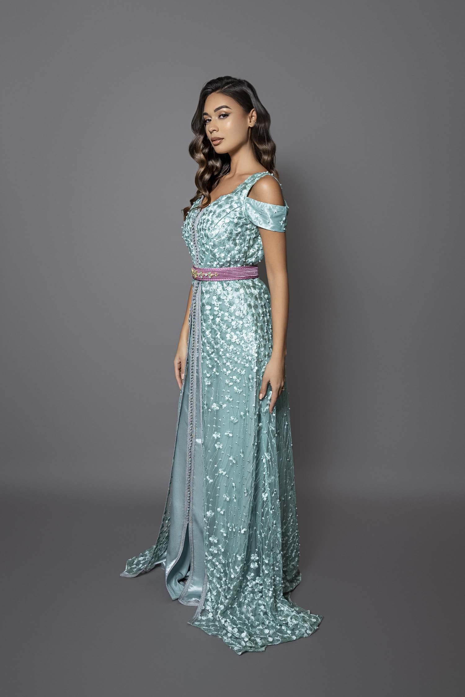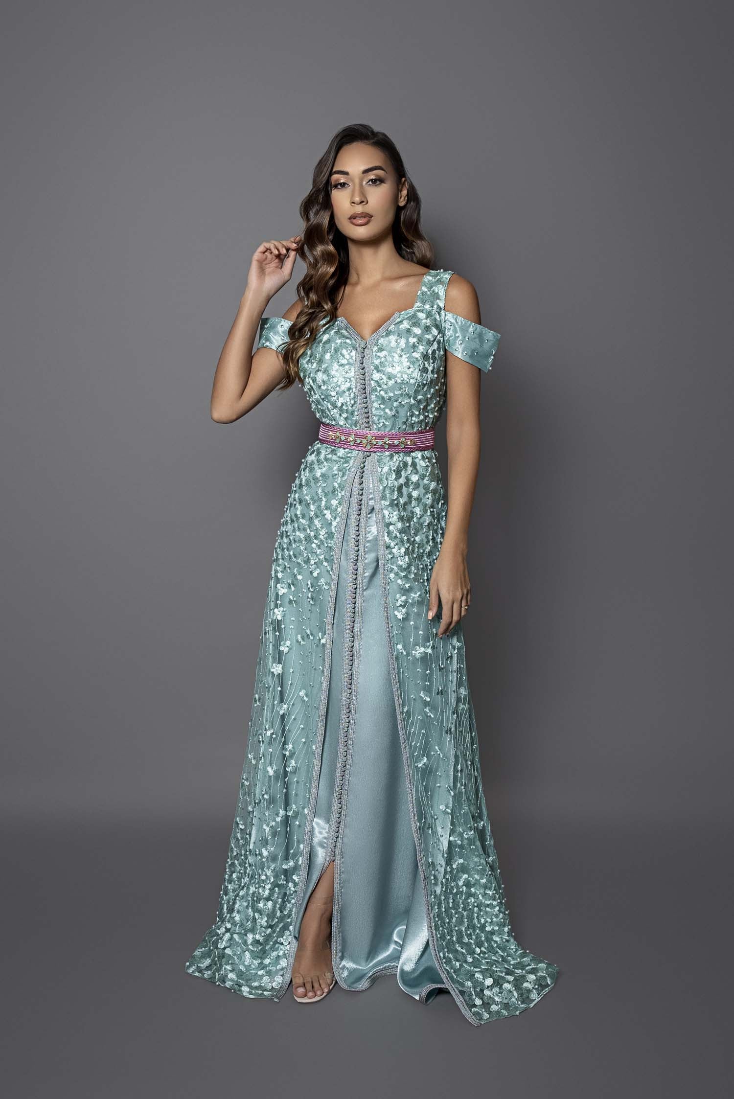 Ce caftan moderne en dentelle vert d'eau et satin de soie sublime vos épaules grâce à une découpe audacieuse et originale. Sa silhouette cintrée, rehaussée d’une ceinture rose en fil de soie ornée de pierres bijoux, allie élégance et modernité. Minimaliste et chic, cette takchita révèle votre allure avec une touche de sophistication artisanale marocaine, parfaite pour un look stylé et sans compromis.