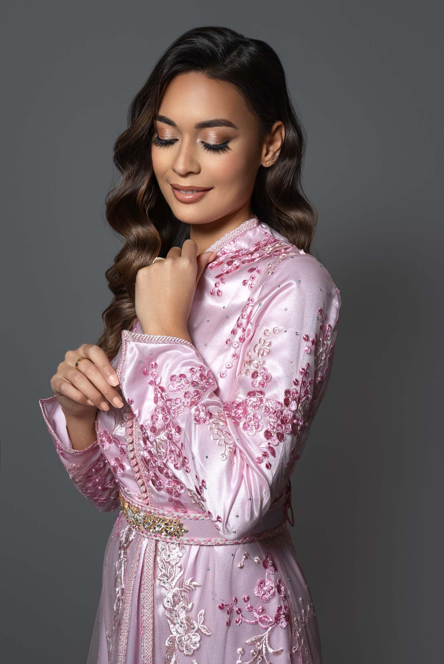Découvrez le Caftan Aydene, une pièce audacieuse alliant élégance et modernité. Ce caftan deux pièces associe un bustier en satin de soie rose à un sur-caftan en dentelle de tulle brodée et perlée, sublimé par un col cygne et des manches longues fantaisie. Sa ceinture ornée de pierres bijoux apporte une touche précieuse, parfaite pour briller lors de vos événements les plus exclusifs. Raffiné et charismatique, ce caftan est un choix incontournable pour affirmer votre style avec assurance.