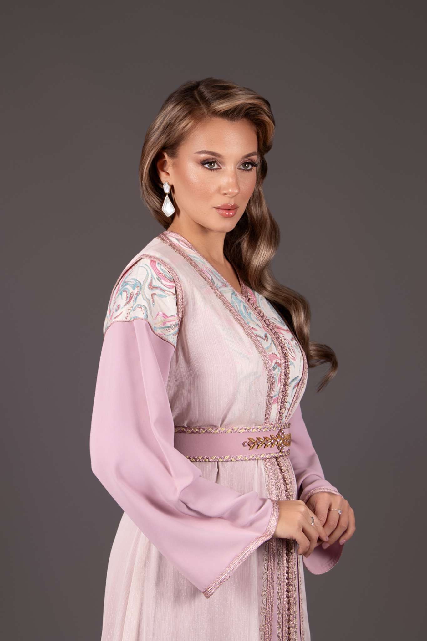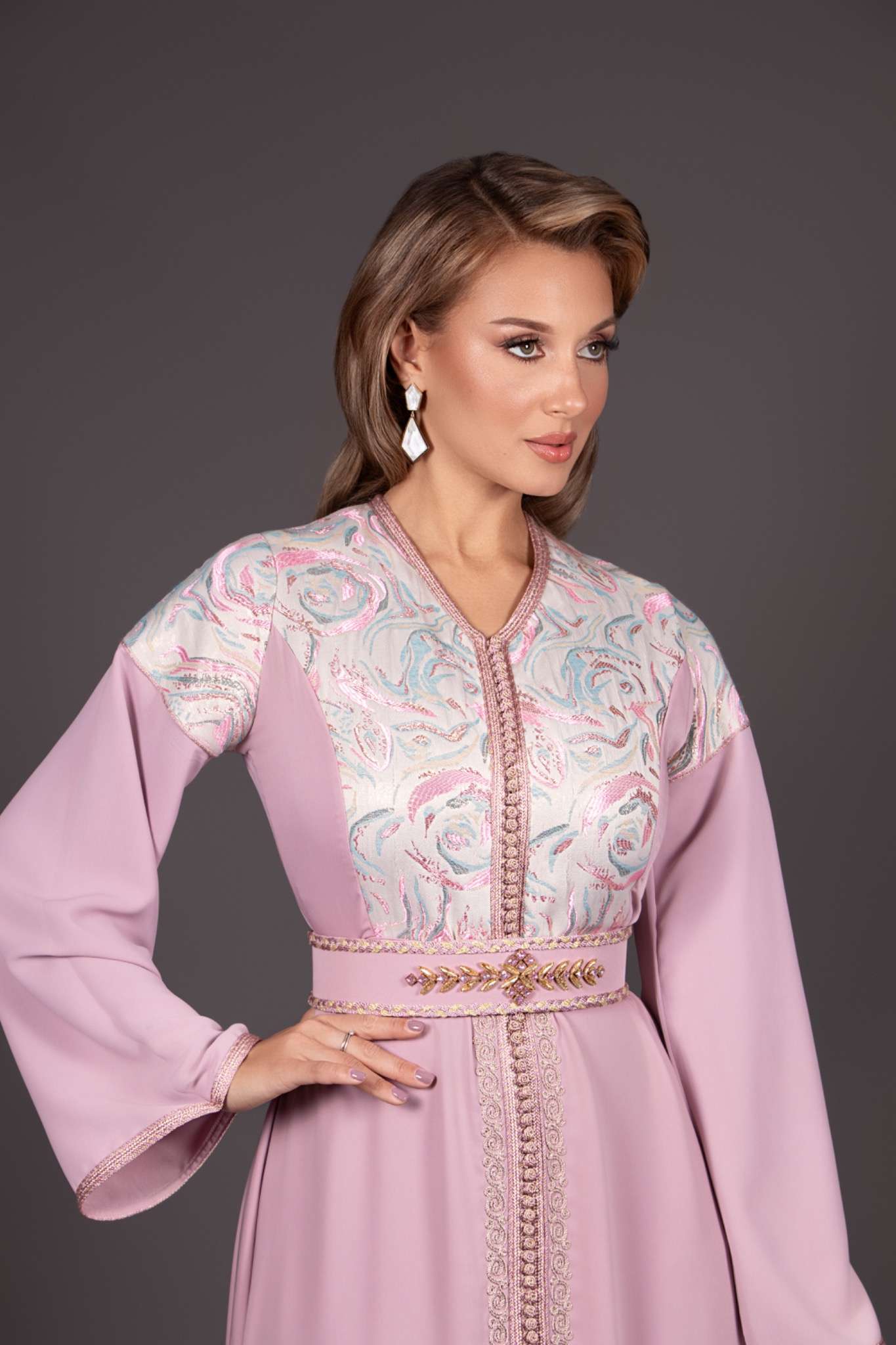 Ce caftan deux pièces allie subtilement douceur et élégance, grâce à son crêpe fluide en vieux rose, sa mousseline légère est ses détails de brocards sur le buste et les épaules.