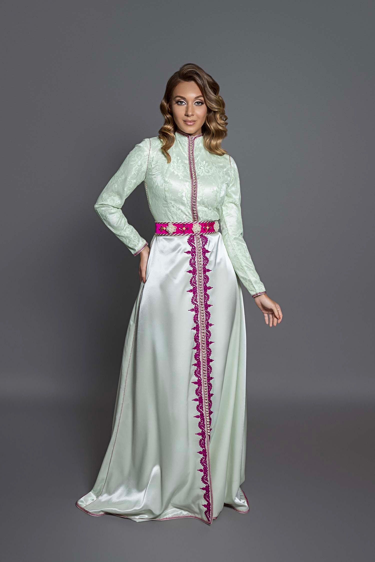 Caftan col montant bi-matière en dentelle et satin de soie vert pâle brodée de fushia, ceinture fushia coordonée avec pierres.