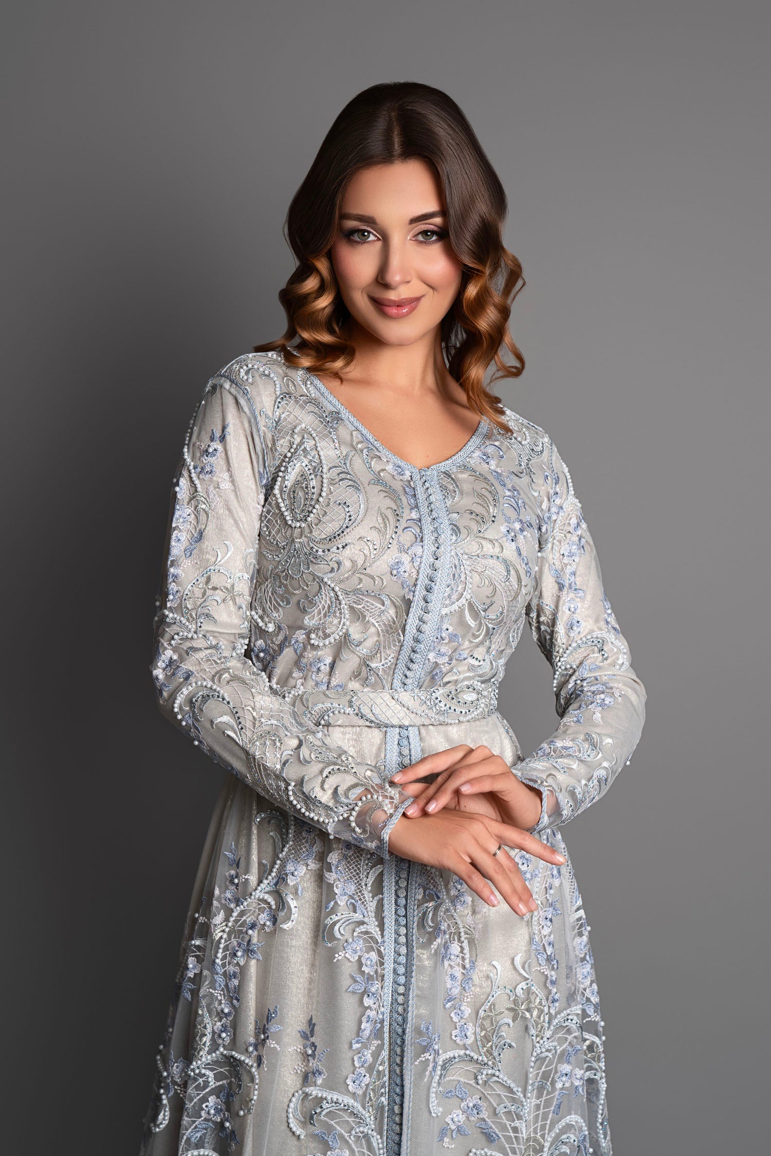 Ce caftan à la coupe traditionnelle à manches longues est confectionné dans une merveilleuse dentelle brodée