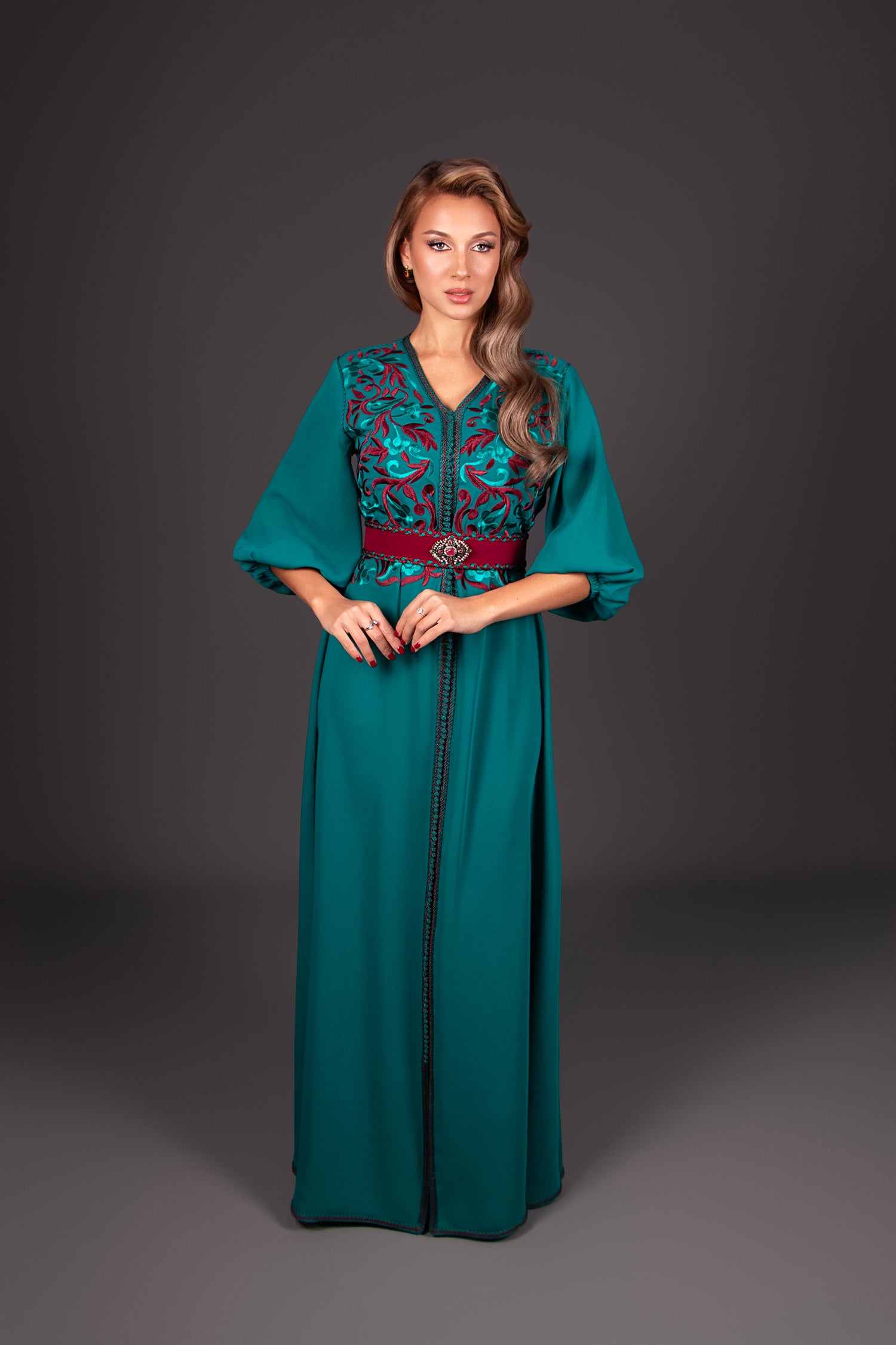 Sublime caftan fluide en crêpe vert émeraude, orné de délicates broderies florales en nuances de bordeaux et de vert.