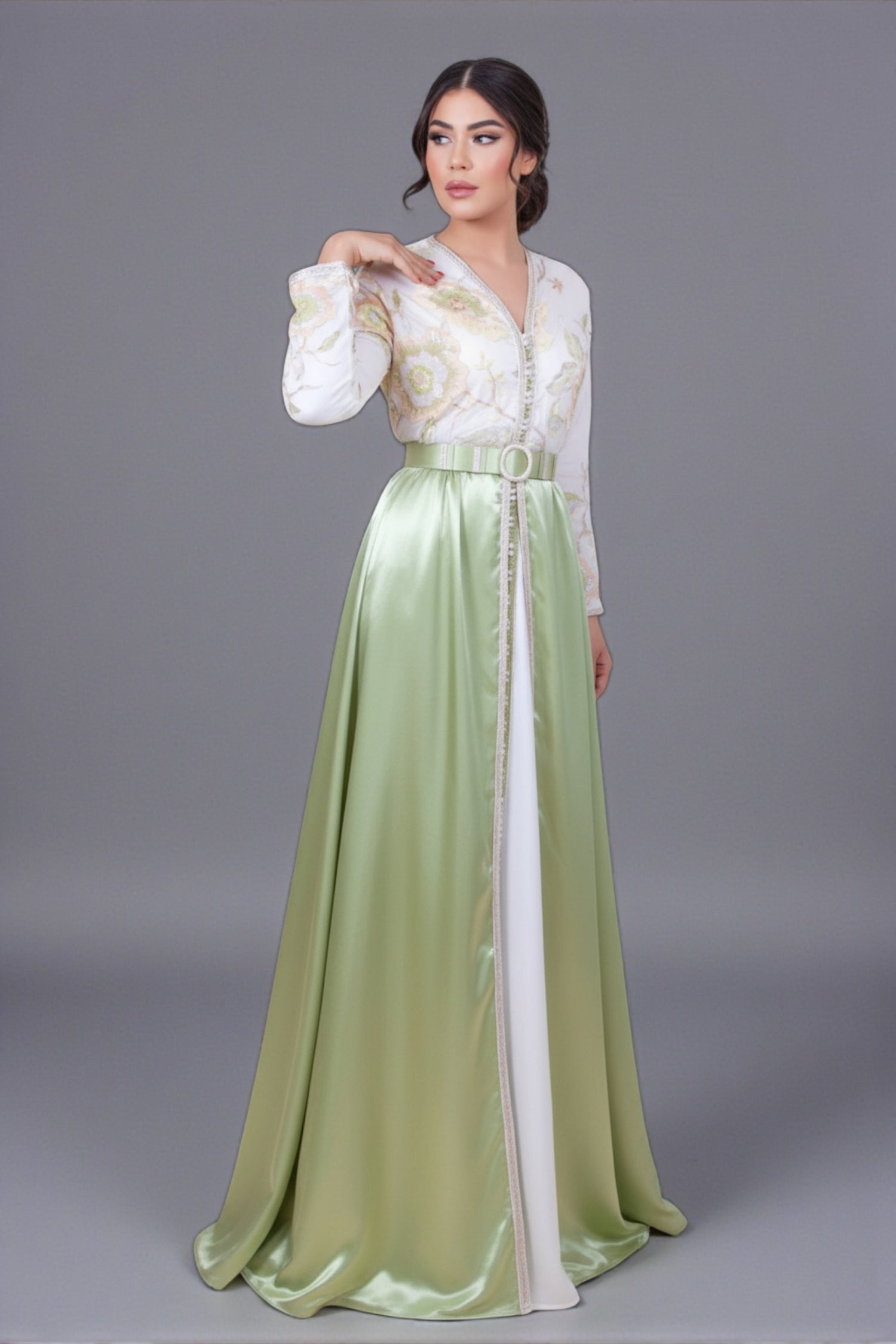 Caftan léger une pièce en dentelle et satin de soie. Ceinture comprise.