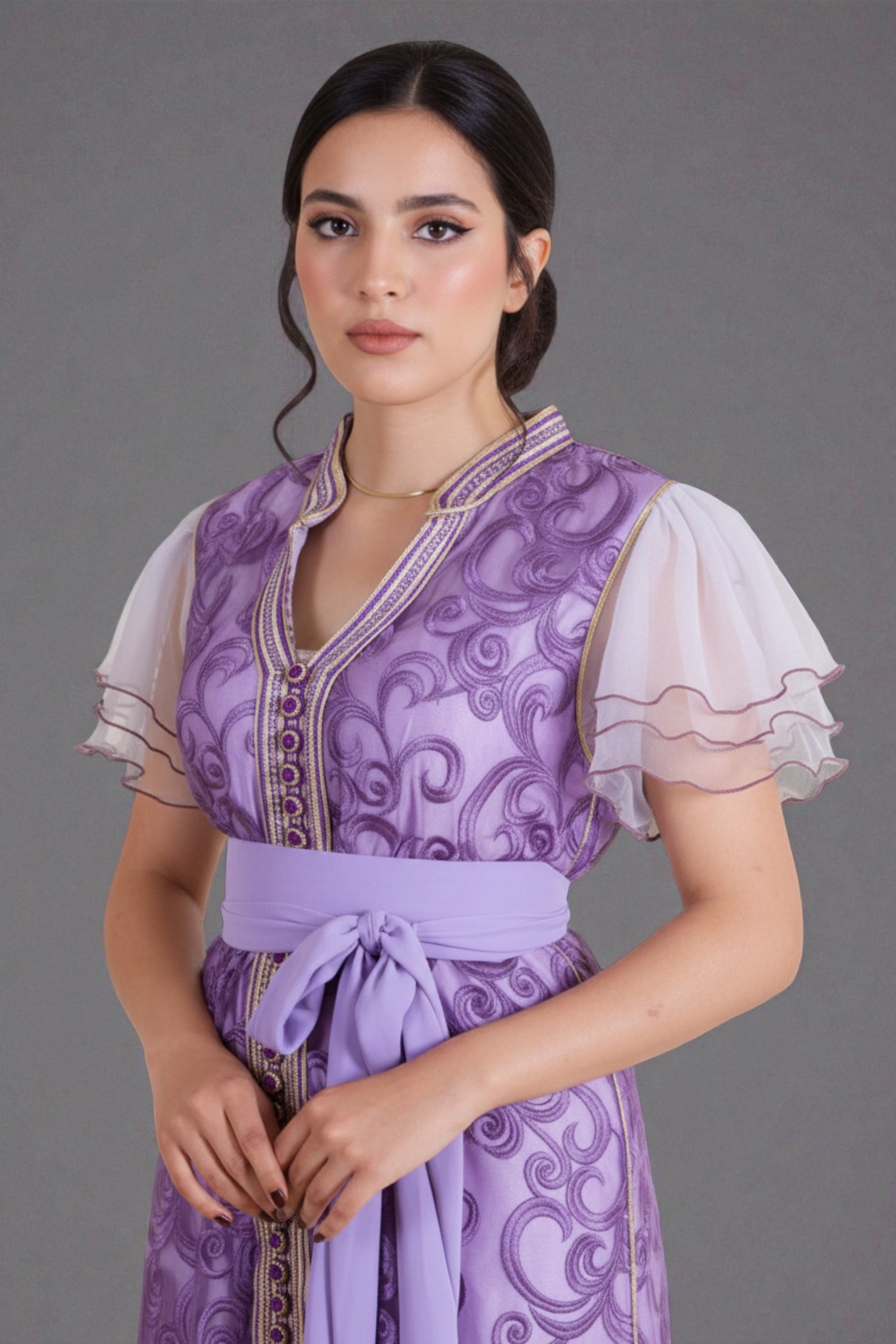 Découvrez le CAFTAN HORTENSIA, une pièce mauve captivante qui réinvente l'élégance intemporelle. Ses manches signature à triple superposition avec finition roulotée créent un effet de mouvement subtil et sophistiqué. Le jeu de matières contrastées apporte une modernité rafraîchissante à ce caftan revisité. Ceinture assortie incluse pour sublimer votre silhouette. Un caftan qui joue avec les codes pour un style à la fois intemporel et contemporain.