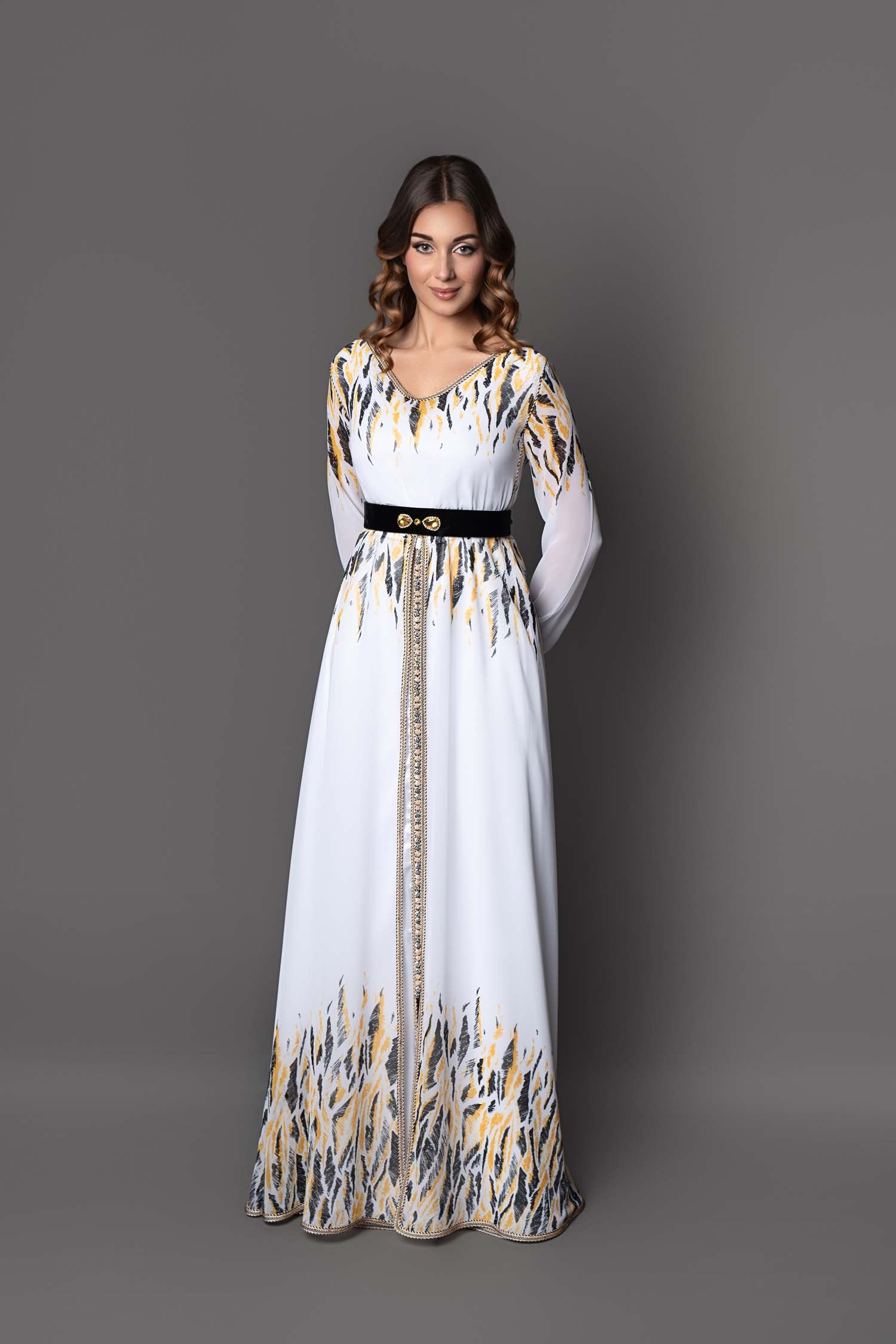 travaillé avec sa sfifa coordonnée ainsi que d'une mousseline imprimée de motifs abstraits. Le tout est parfait d'une ceinture en velours noir.