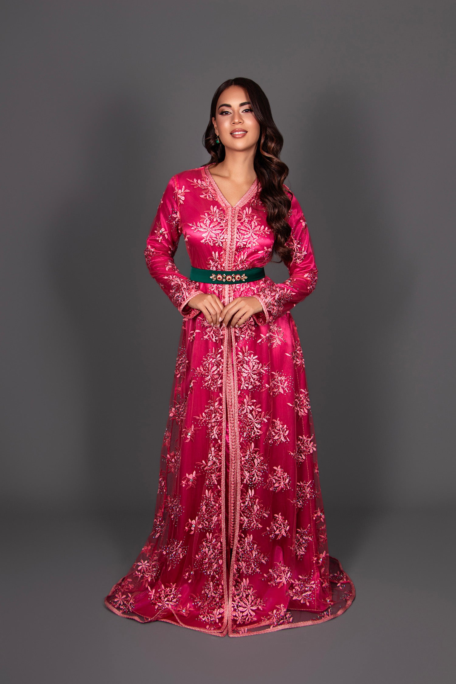 Découvrez cette takchita deux pièces, qui allie raffinement et tradition. Confectionnée en satin de soie rose foncé, son tissu fluide et soyeux sublime la silhouette. Ses manches longues et son col en V apportent confort, tandis que la dentelle de tulle brodée couleur nacarat, rehaussée de strass scintillants, crée un jeu subtil de lumière et de texture.
