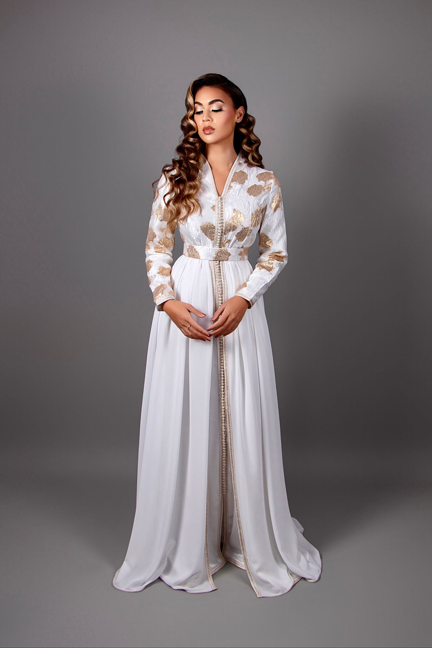 Élégant et raffiné, ce caftan en brocart blanc et or capture l'essence de la sophistication.