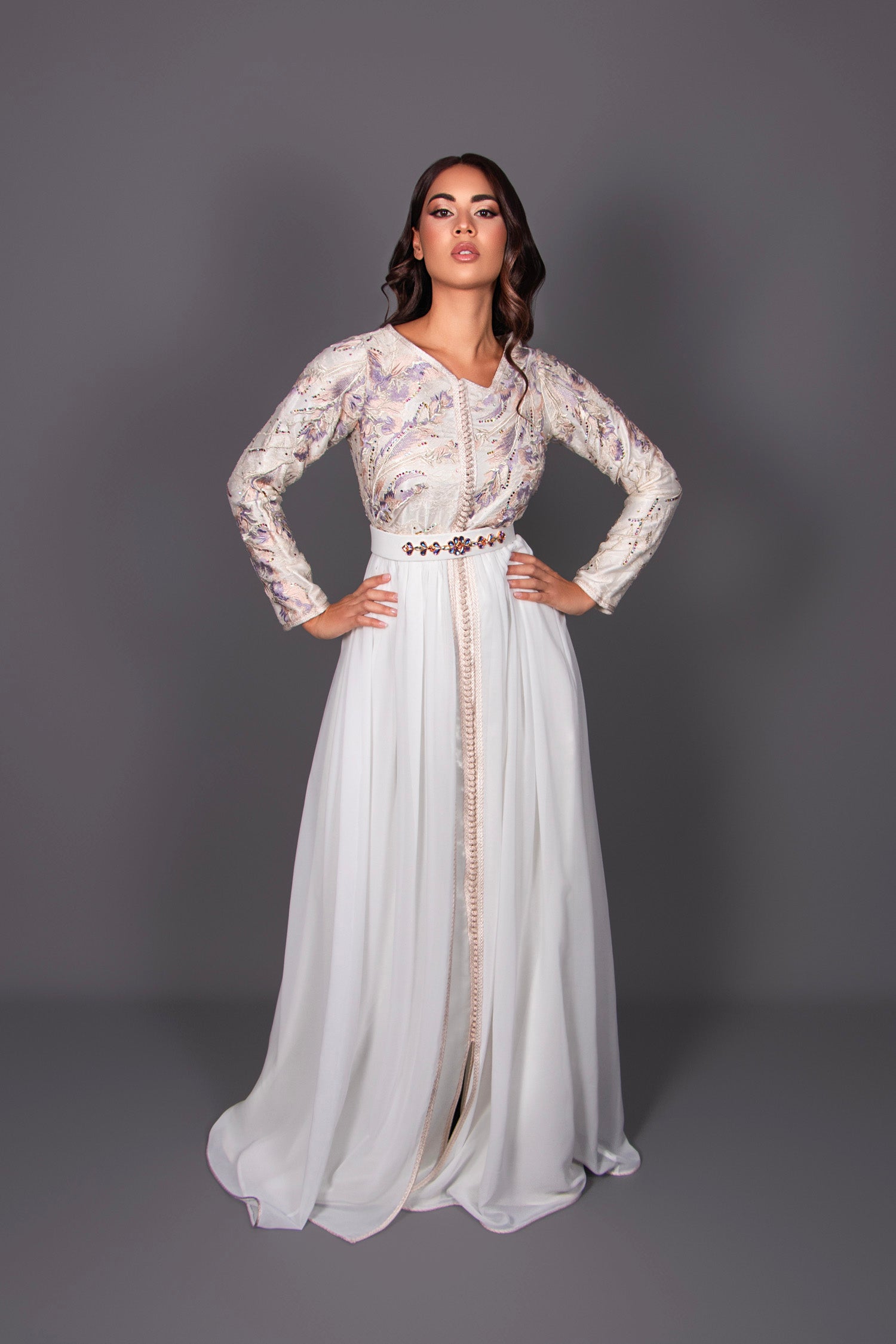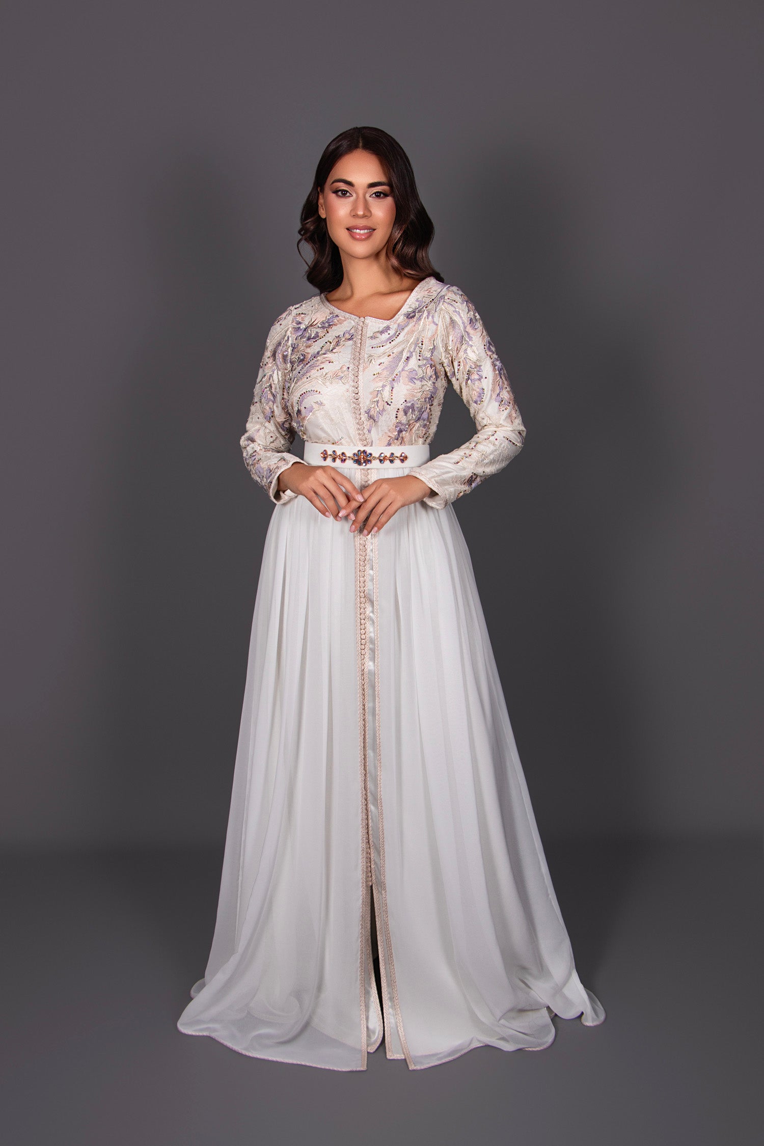 Caftan au design unique avec col asymétrique, sublimé par une jupe en mousseline vaporeuse pour une élégance aérienne et raffinée.