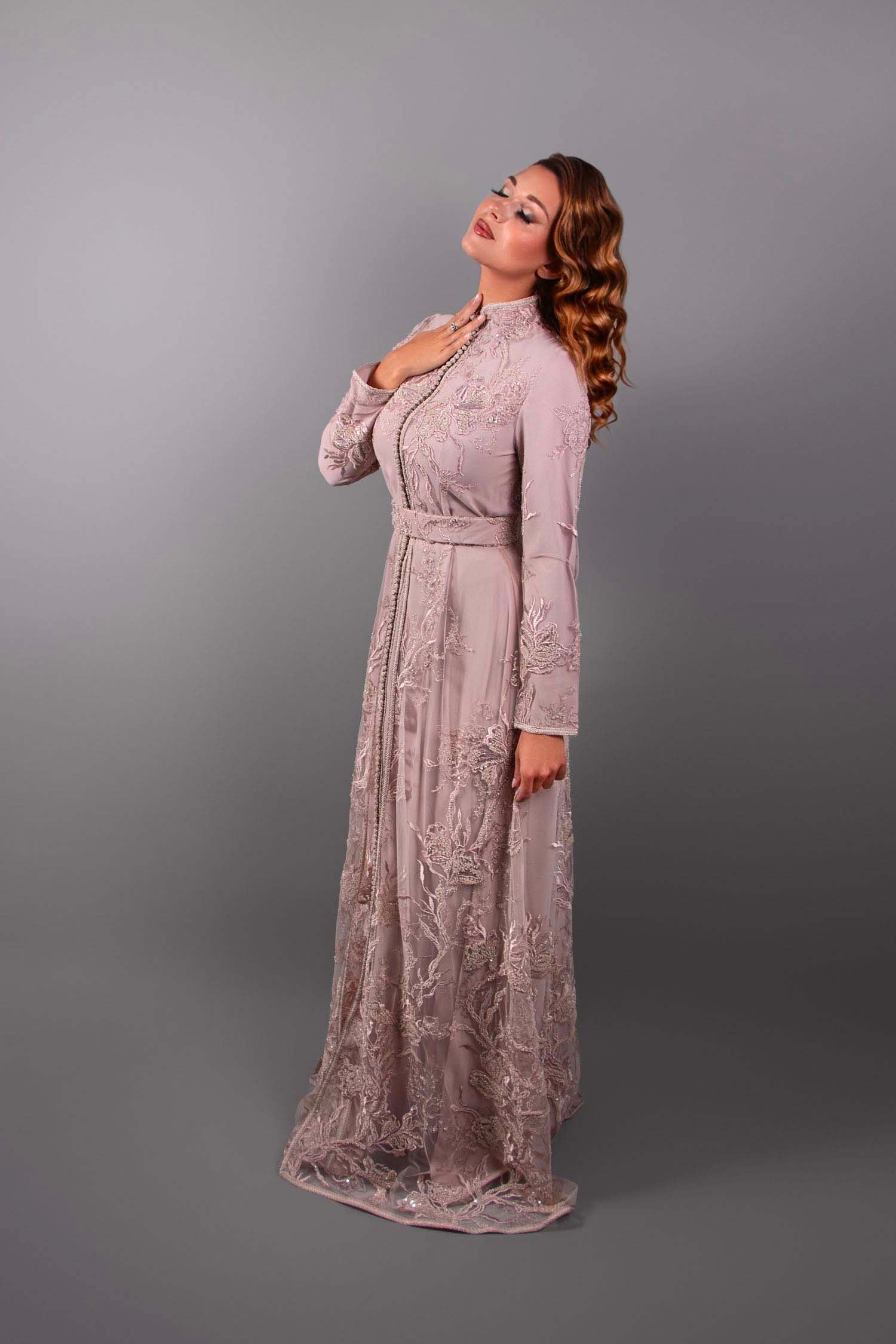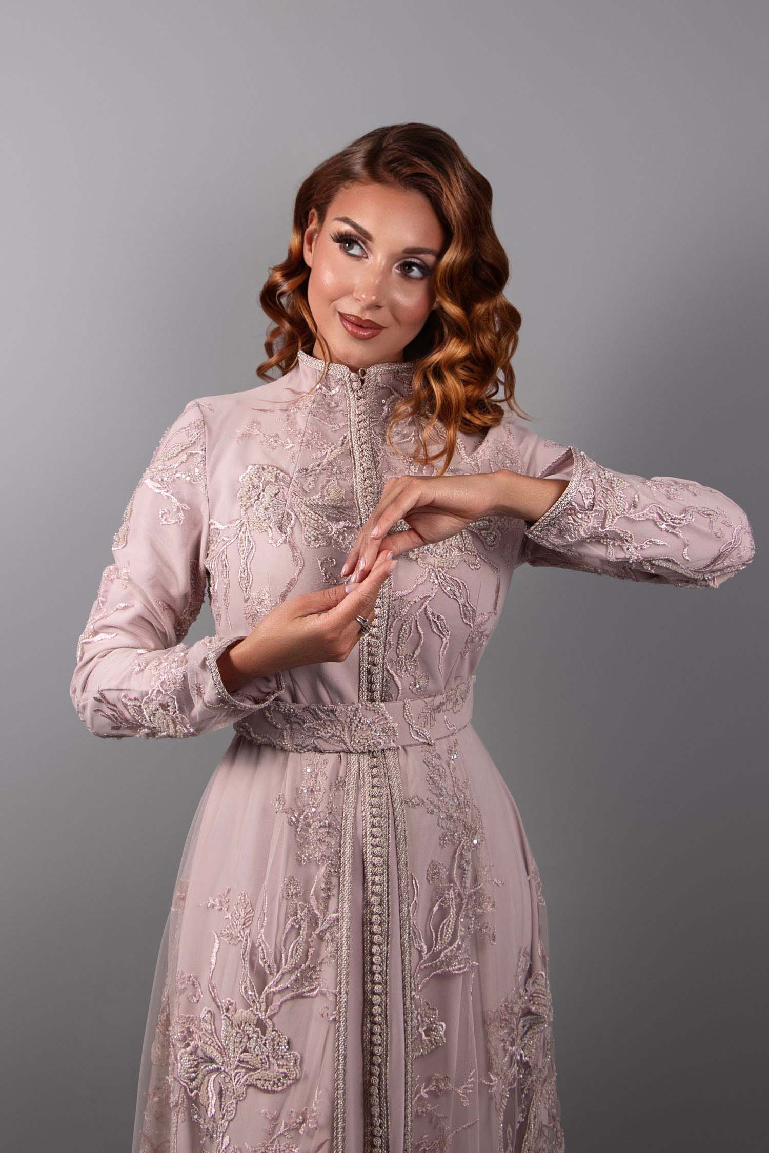 Découvrez notre somptueux caftan marocain en crêpe et dentelle dans un ton vieux rose.