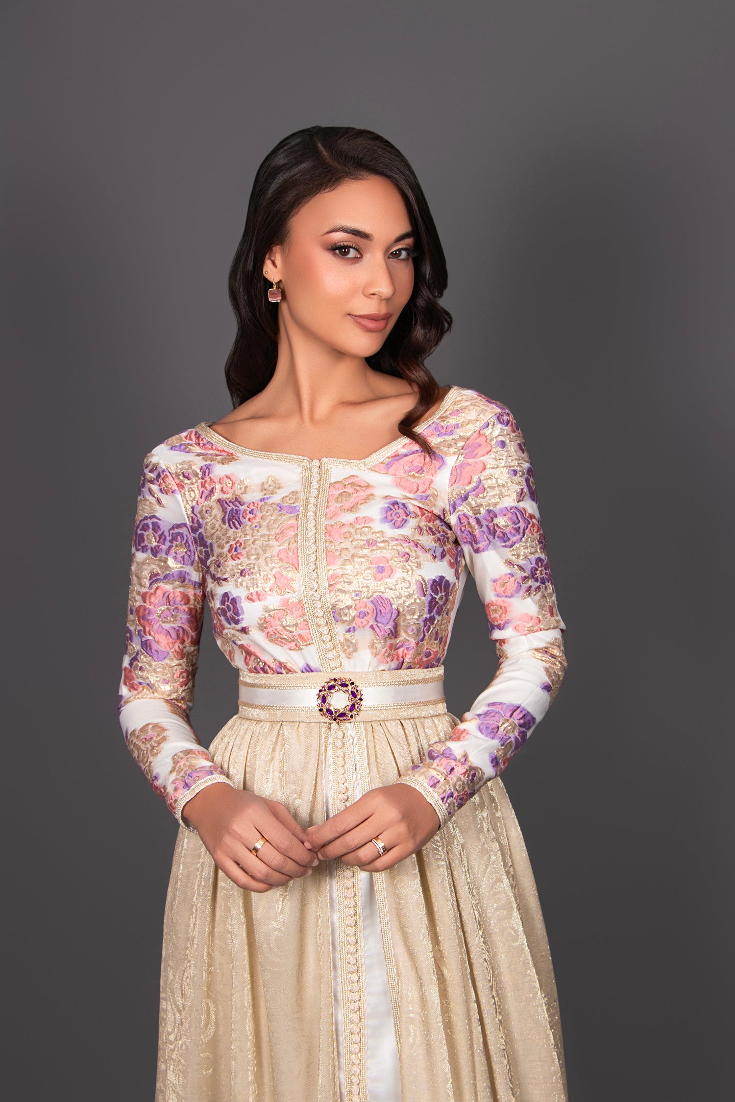 Élégant et simple, notre CAFTAN LYZIENNE en brocard vous séduira avec ses tons violet et mauve. Sa jupe en lurex or apporte une touche d'éclat à votre tenue. Parfait pour des occasions spéciales et pour vous démarquer avec style.