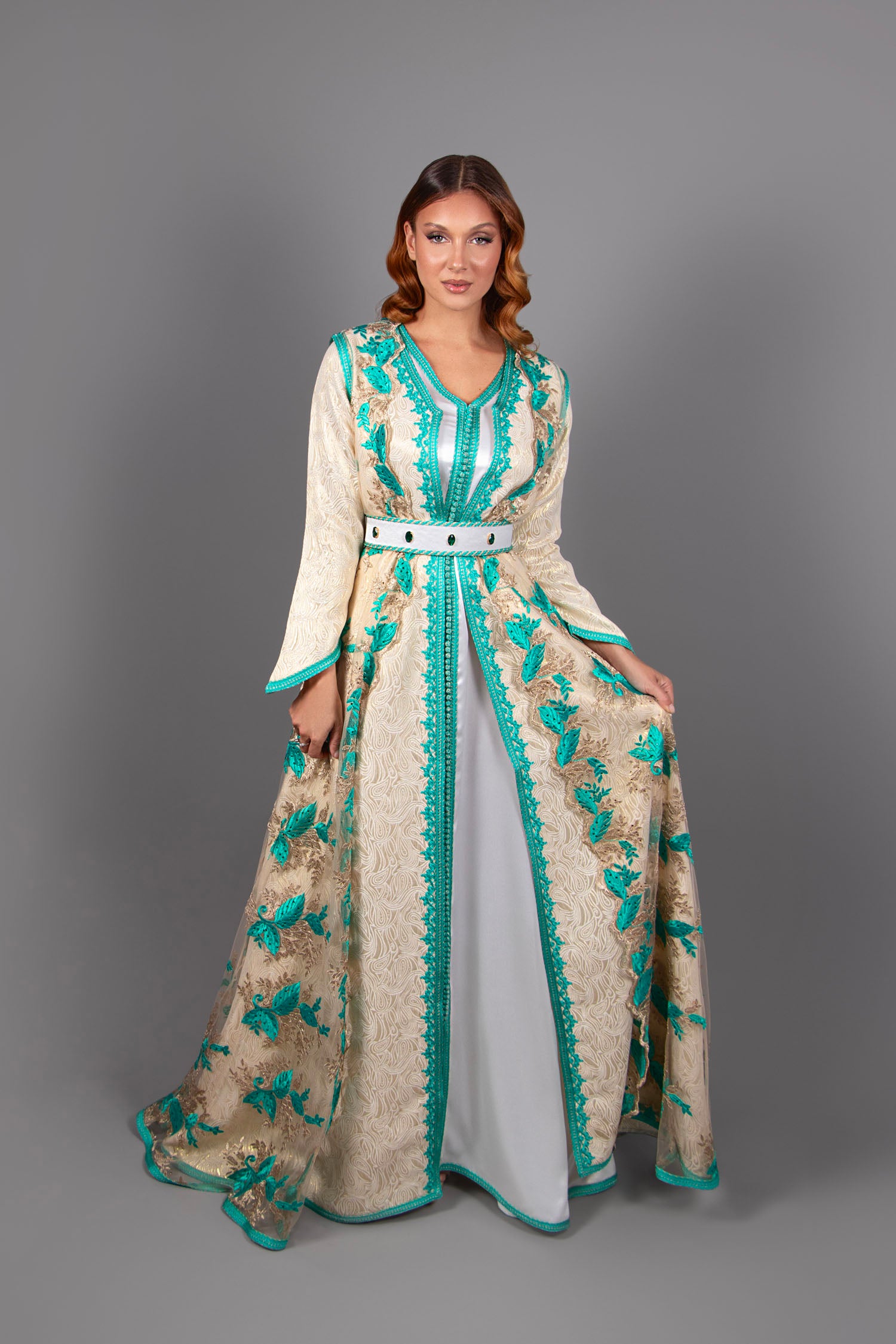 Le tout est agrémenté d'une ceinture assortie coordonnée en brocard décorée de pierres bijoux émeraude.