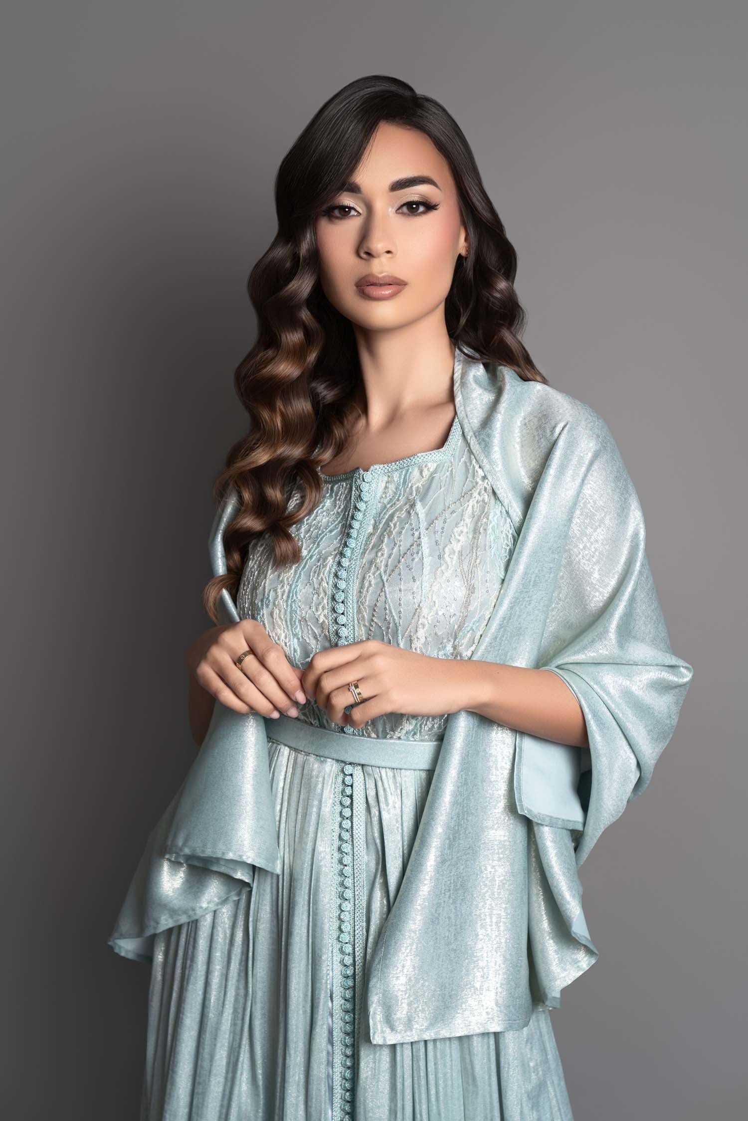 Découvrez le Caftan Américaine, une pièce audacieuse et légère qui capture l’essence d’un été frais. Ses manches américaines offrent une silhouette fluide, sublimée par des teintes célestes de blanc pur et bleu glace. La dentelle premium dessine des arabesques délicates sur la peau, tandis que le lamé scintillant ajoute une touche mystérieuse et captivante. Ce caftan est une invitation à se sentir libre et élégante, porté par une douceur infinie et un éclat subtil qui ne passent pas inaperçus. Osez la fraîcheur et l’élégance réinventée.