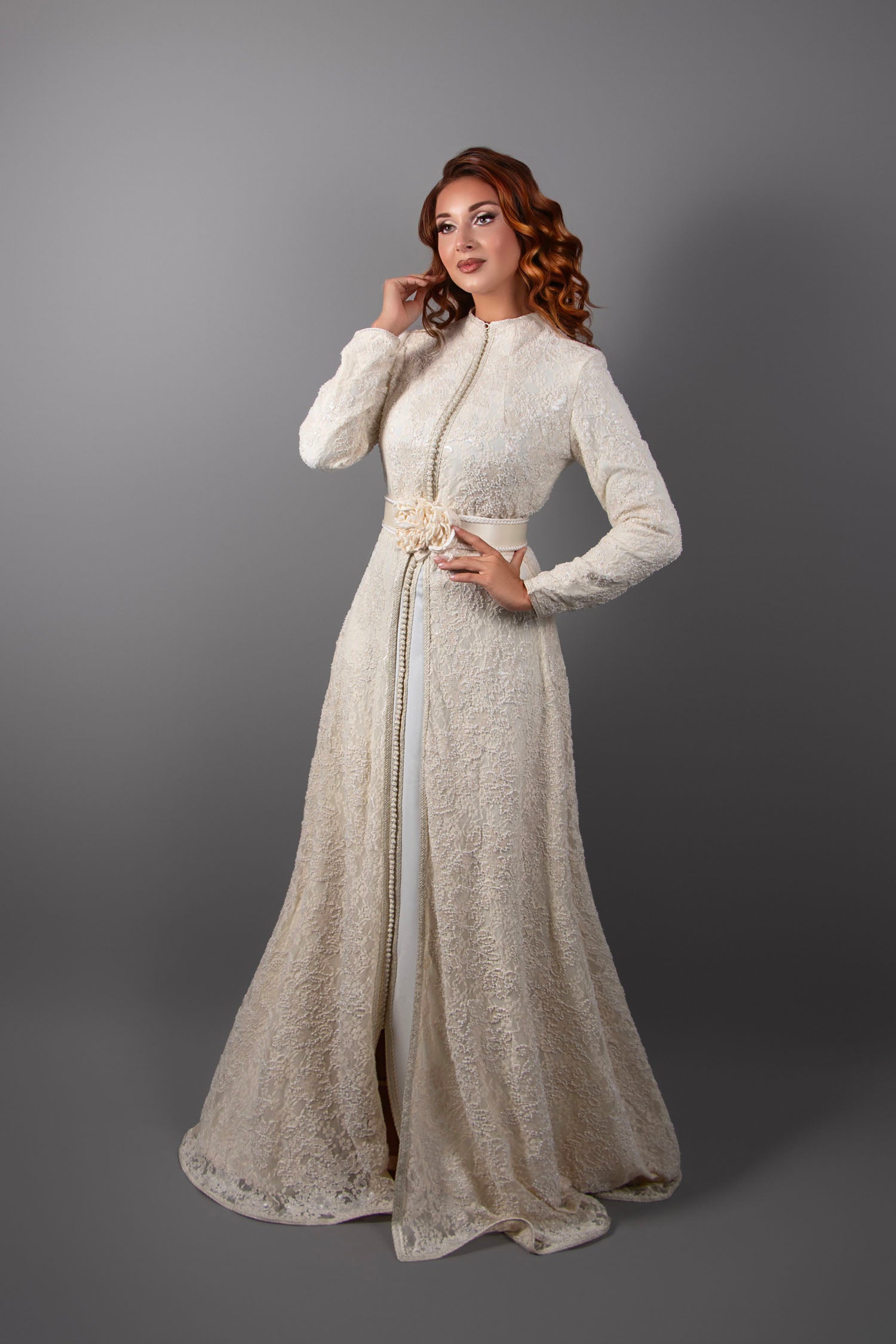 Cette robe caftan est confectionnée dans une magnifique dentelle entièrement perlée de petites perles discrètes.