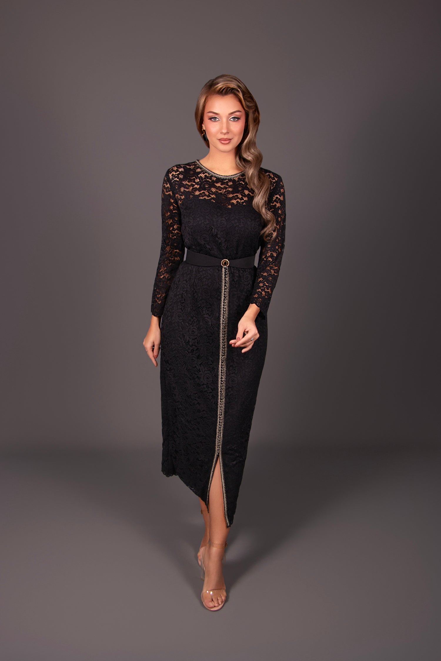 Découvrez le caftan Nina, un modèle court en dentelle noire audacieuse qui sublime votre silhouette. Sa ceinture ajustée souligne élégamment la taille, ajoutant une touche de charme et de caractère à votre tenue. Parfait pour celles qui osent allier tradition et modernité avec une allure captivante.