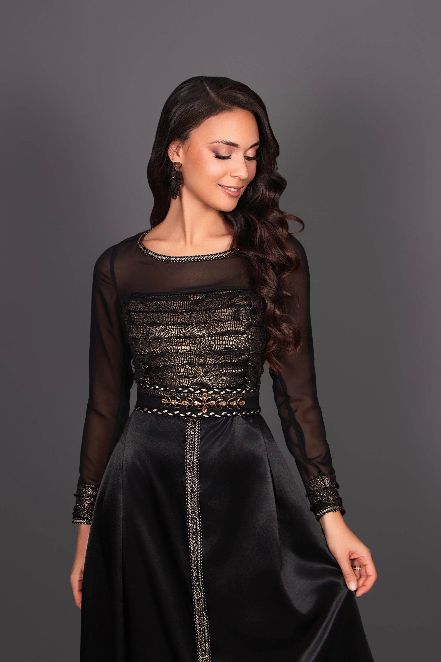 Sa coupe moderne et ajustée au niveau du buste sublime la silhouette, tandis que son tissu texturé apporte une touche de sophistication. Les détails transparents ajoutent une note subtile d’audace, faisant de cette robe un parfait équilibre entre traditions orientales et influences occidentales.