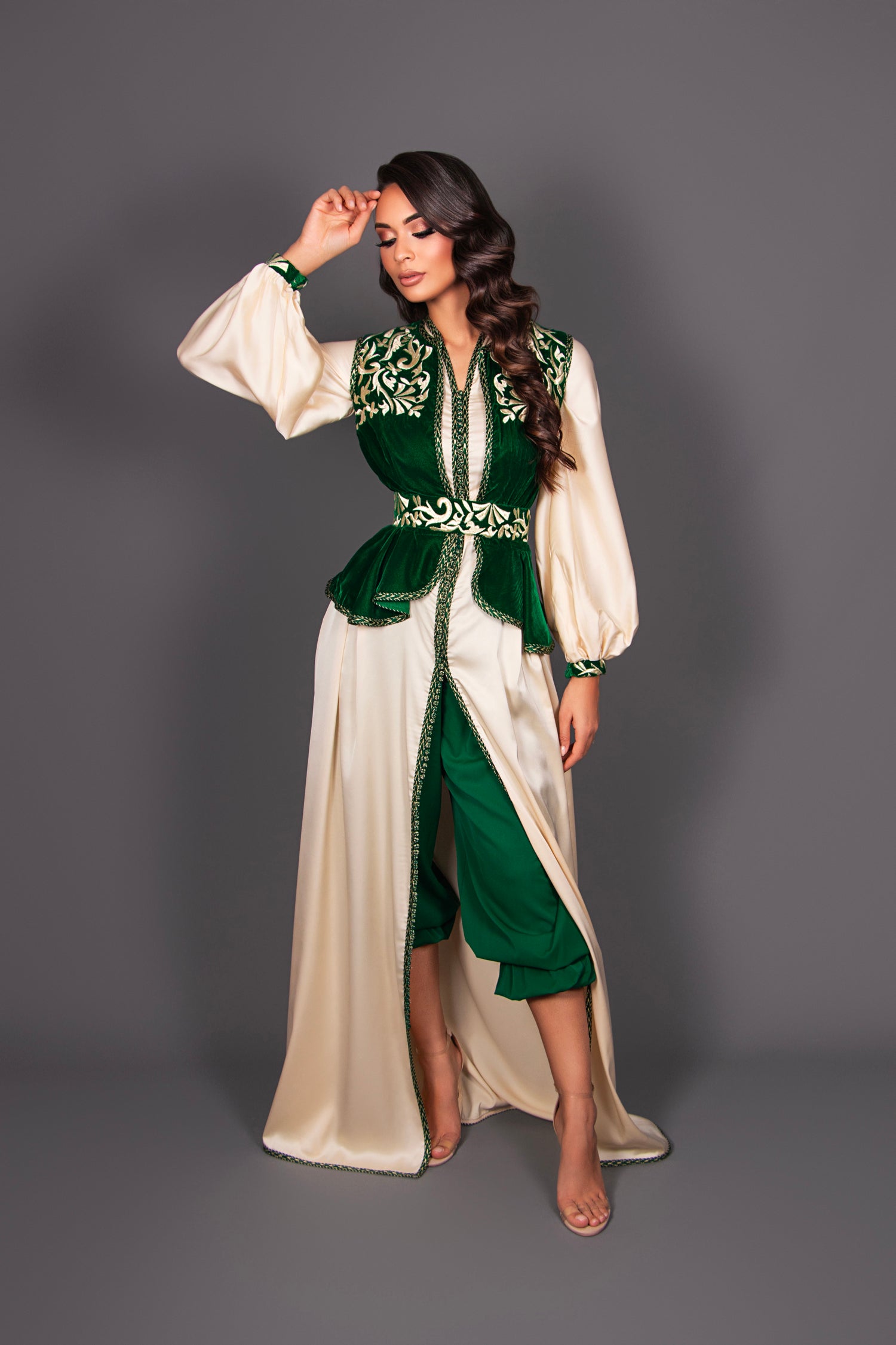 Ceinture coordonnée en velour vert brodé or.