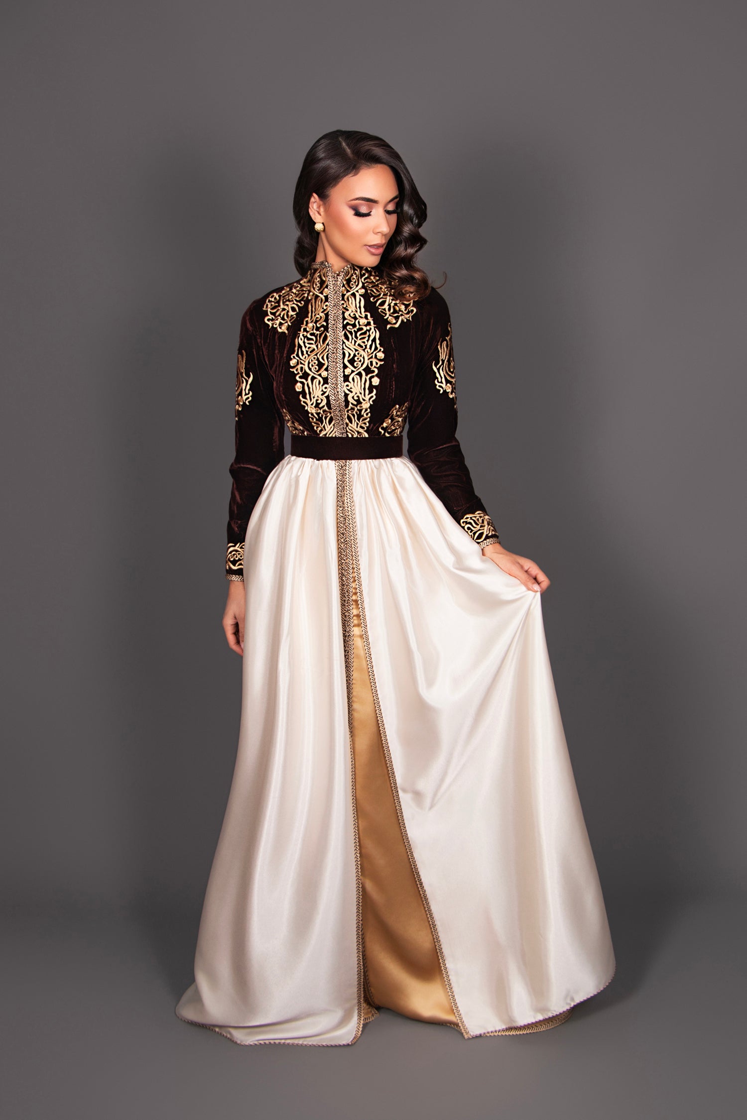 Découvrez l'élégance intemporelle de ce somptueux caftan en velours marron, richement brodé de motifs dorés raffinés.