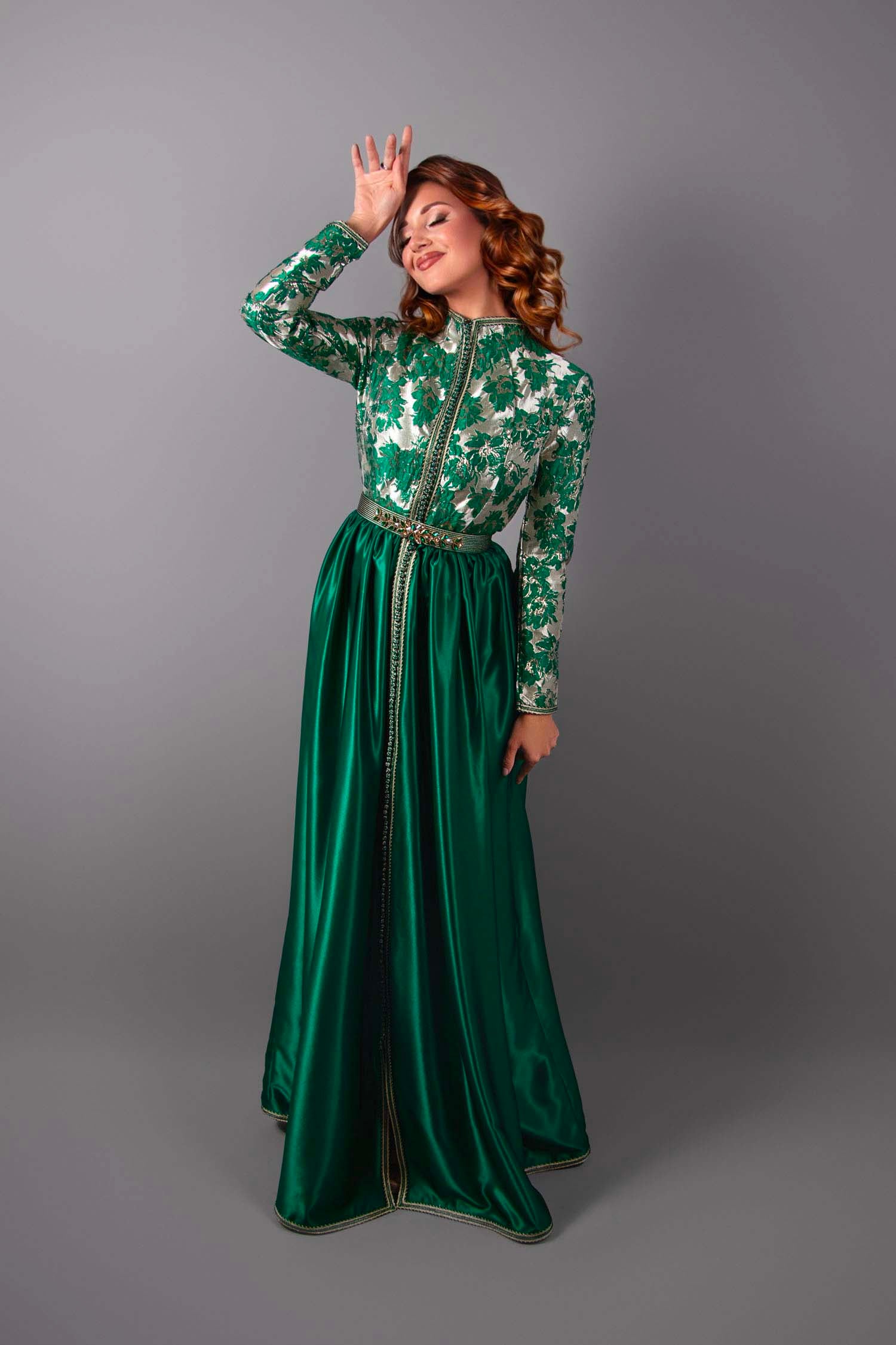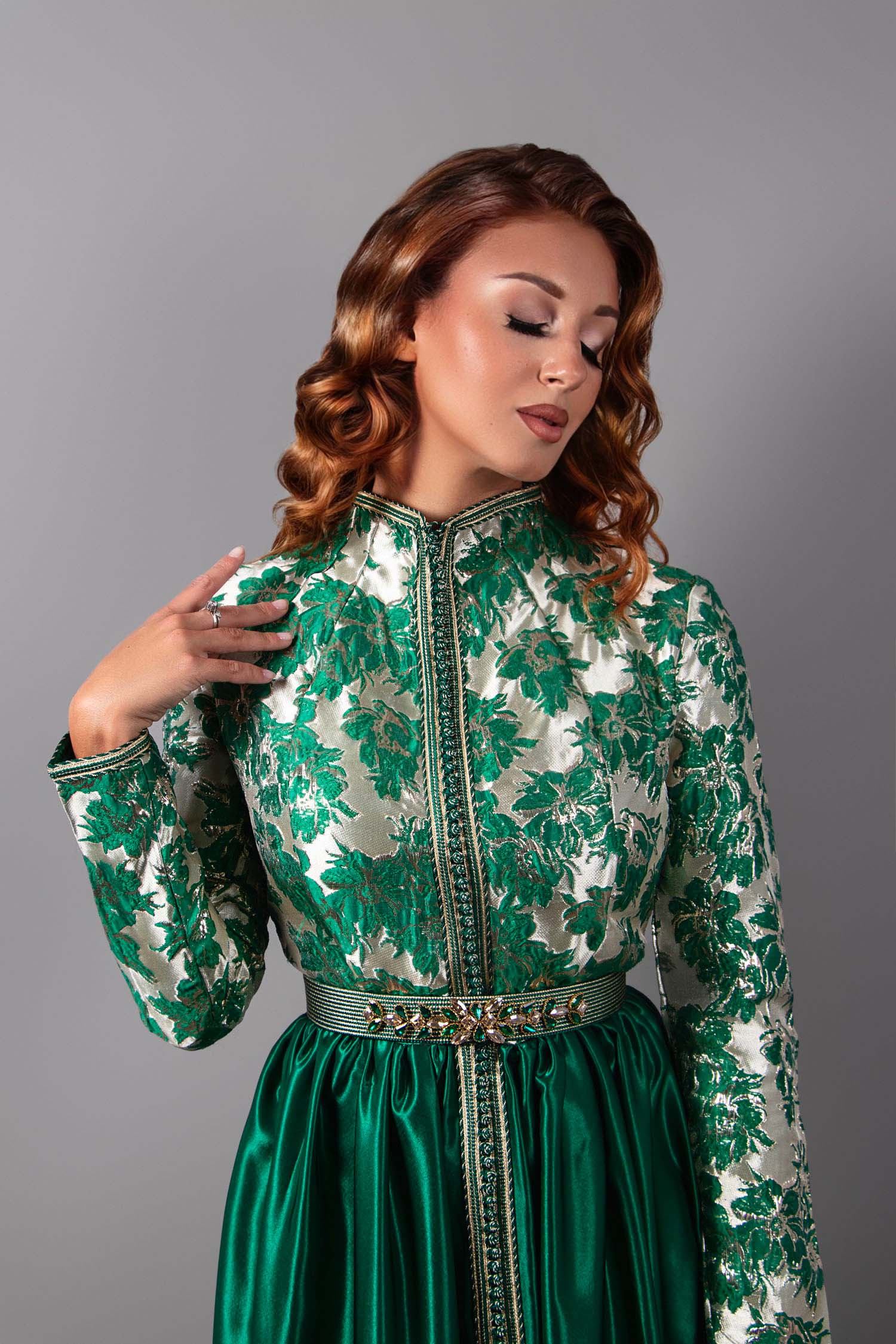 Découvrez ce ravissant caftan en brocard rebroché or et satin de soie vert sapin.