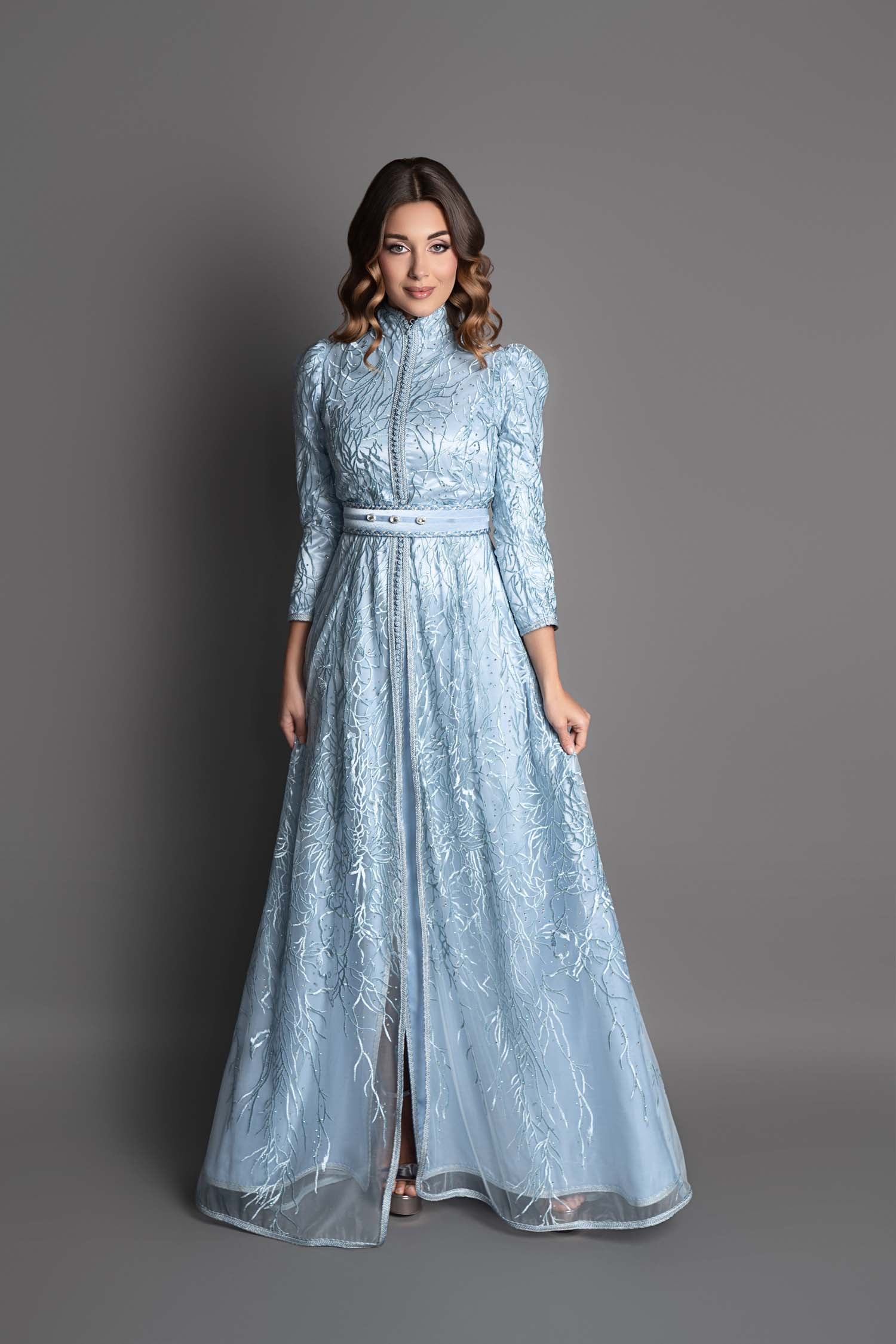 Le caftan Skylac est une pièce d'une beauté exceptionnelle, arborant une teinte bleu ciel envoûtante.