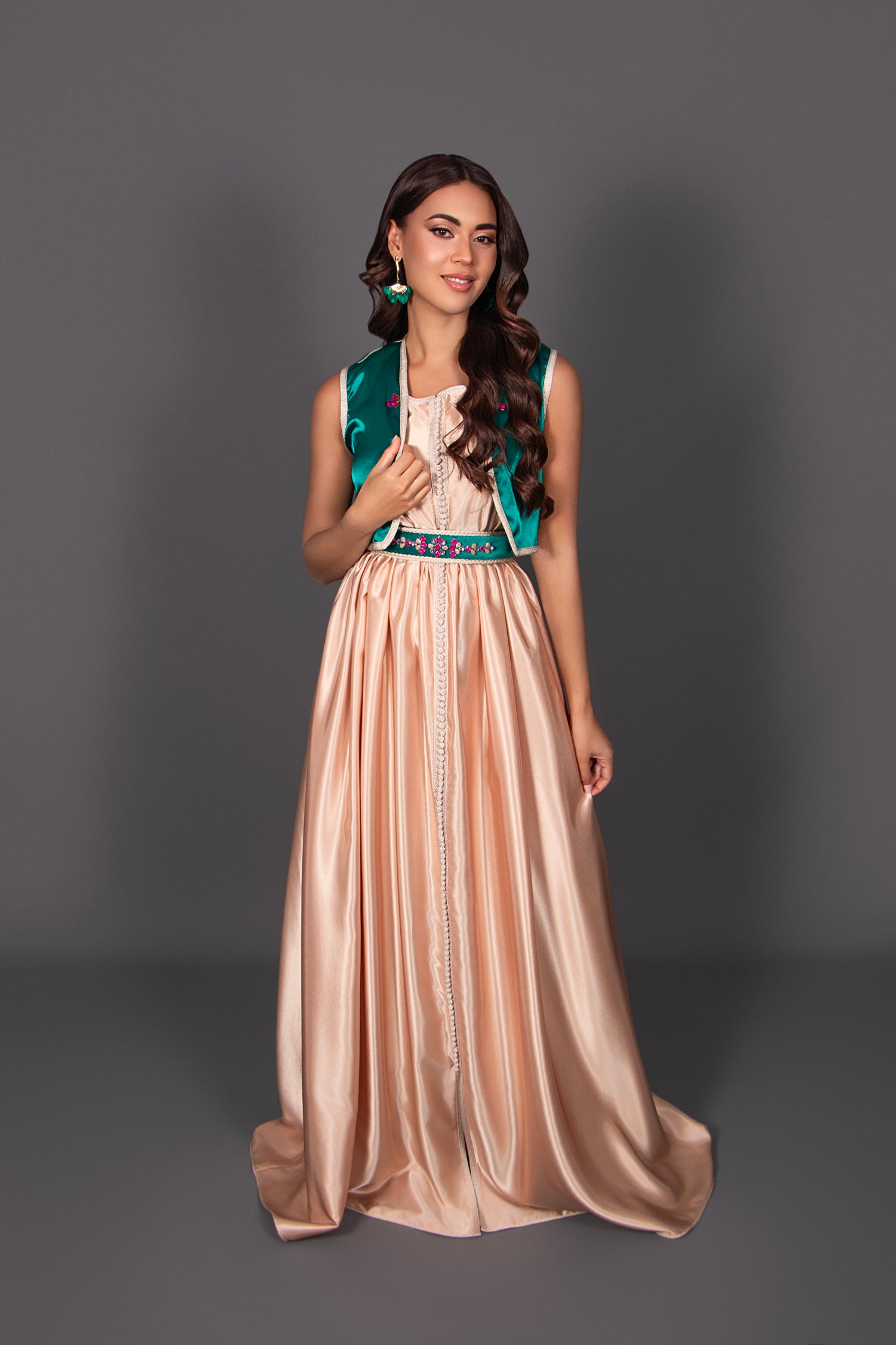 Laissez-vous séduire par l'élégance épurée de ce caftan sans manches en satin de soie saumon, sublimé par un boléro en satin de soie vert, délicatement orné de petites pierres fuchsia.