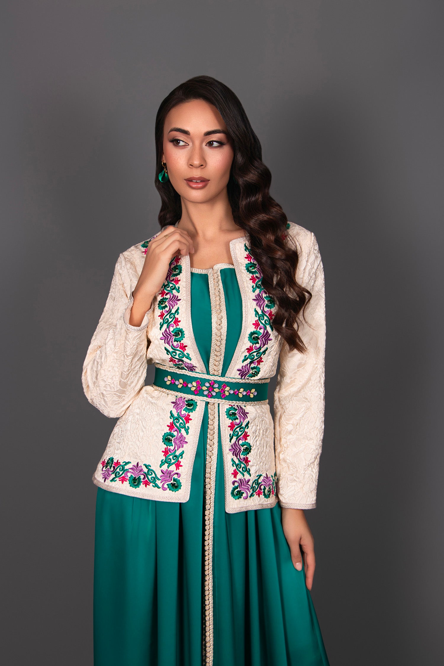 Plongez dans l'élégance intemporelle de ce caftan sans manches en drap de soie vert émeraude, sublimé par sa jupe froncée fluide intégrée qui apporte légèreté et mouvement.