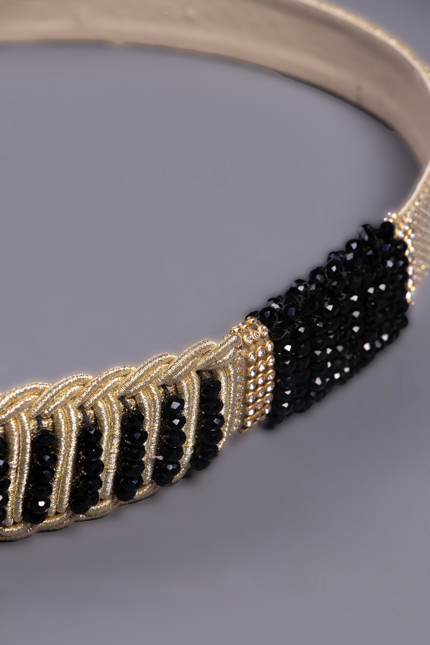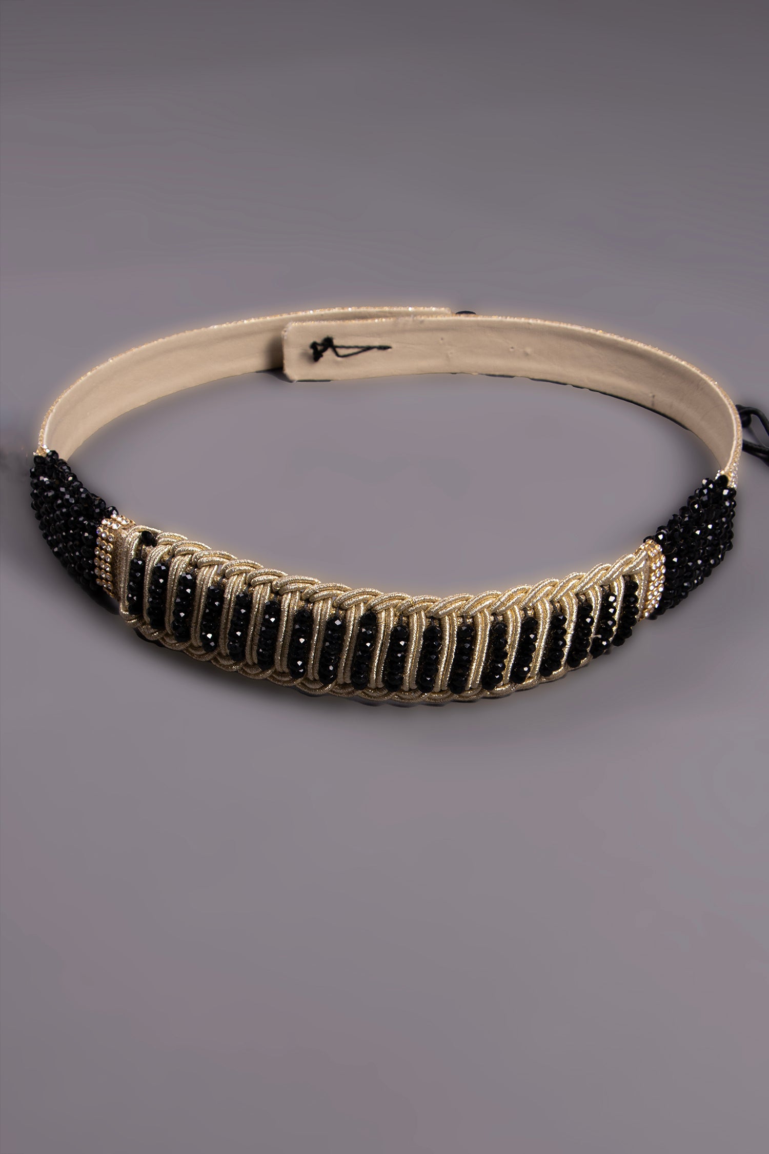 Apportez une touche enchantée à votre tenue avec la ceinture Aicha. Son tressage de perles noires délicates sur une base dorée sublime votre caftan et lui offre un look unique et raffiné. Idéale pour personnaliser et illuminer votre style avec élégance et originalité.