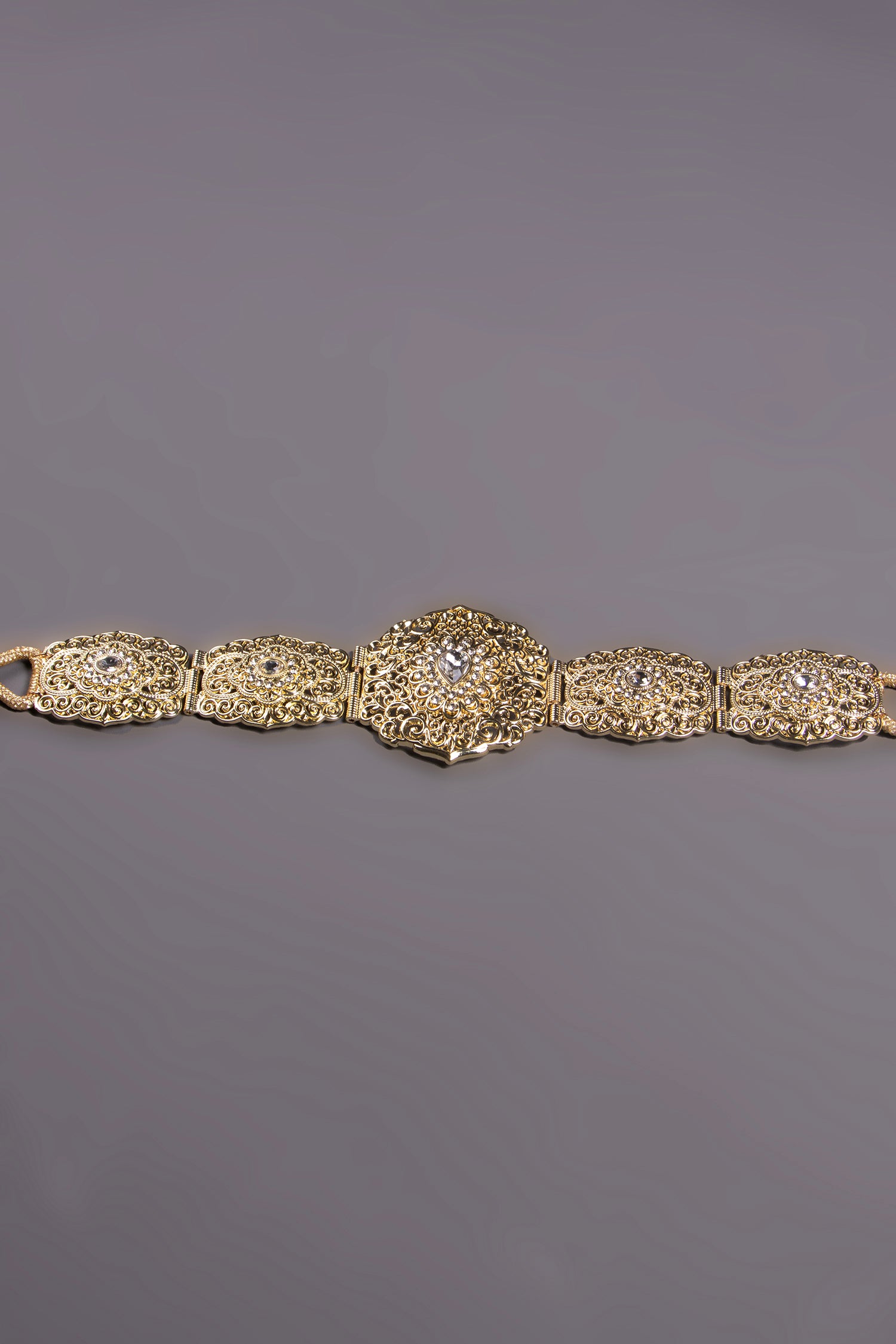 Apportez une touche de magie à votre look avec la ceinture Massira ! Son filigrane doré finement travaillé et ses cristaux scintillants illuminent votre caftan ou robe de cérémonie. Grâce à son cordon tressé souple et ajustable, elle se noue facilement à la taille pour un maintien parfait, quelle que soit votre silhouette. Un accessoire joyeux et élégant pour célébrer chaque occasion avec brillance !
