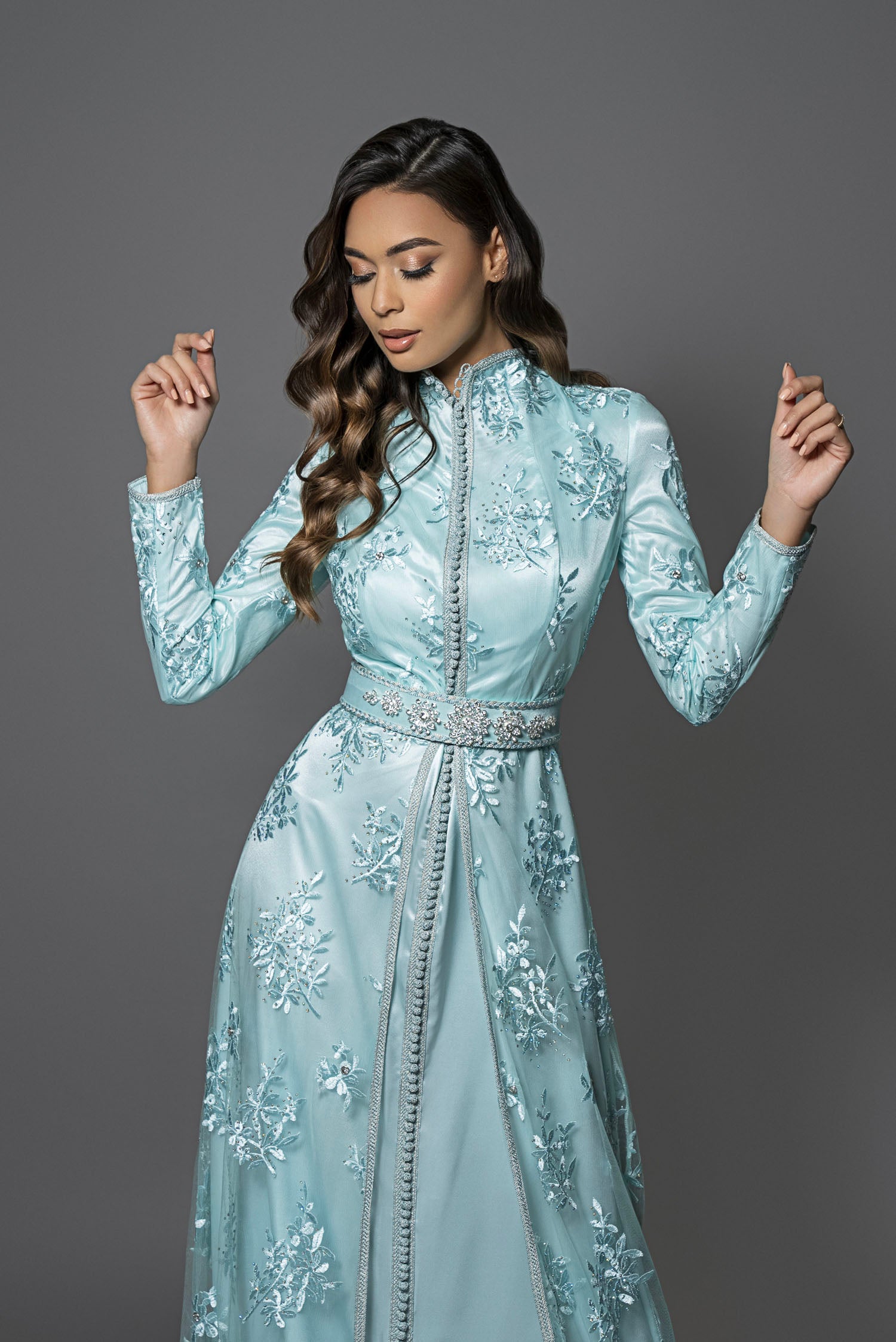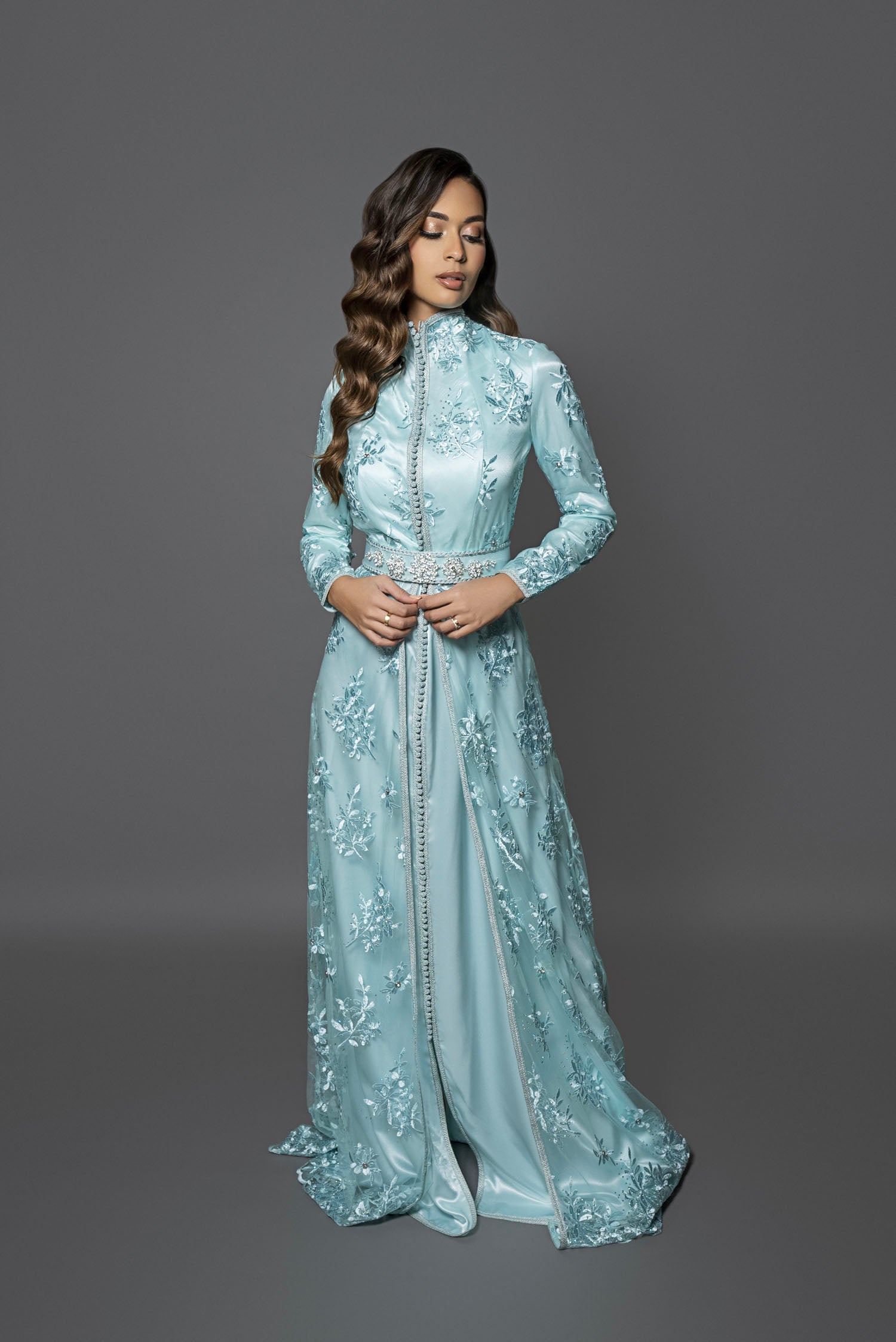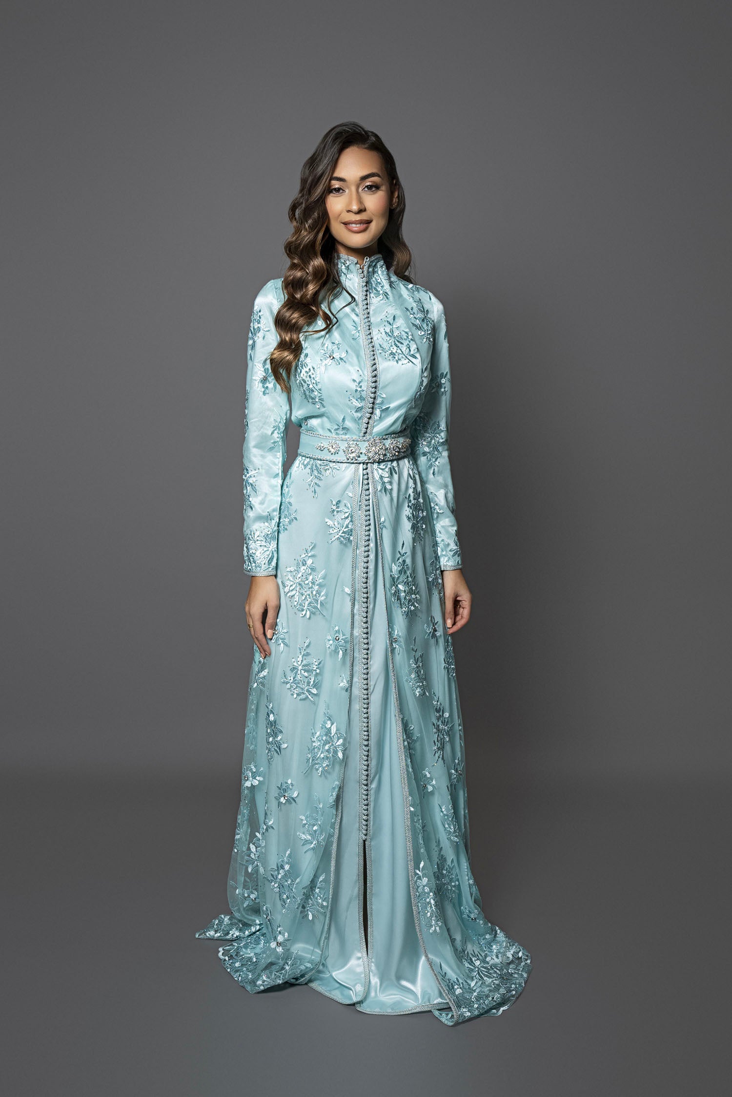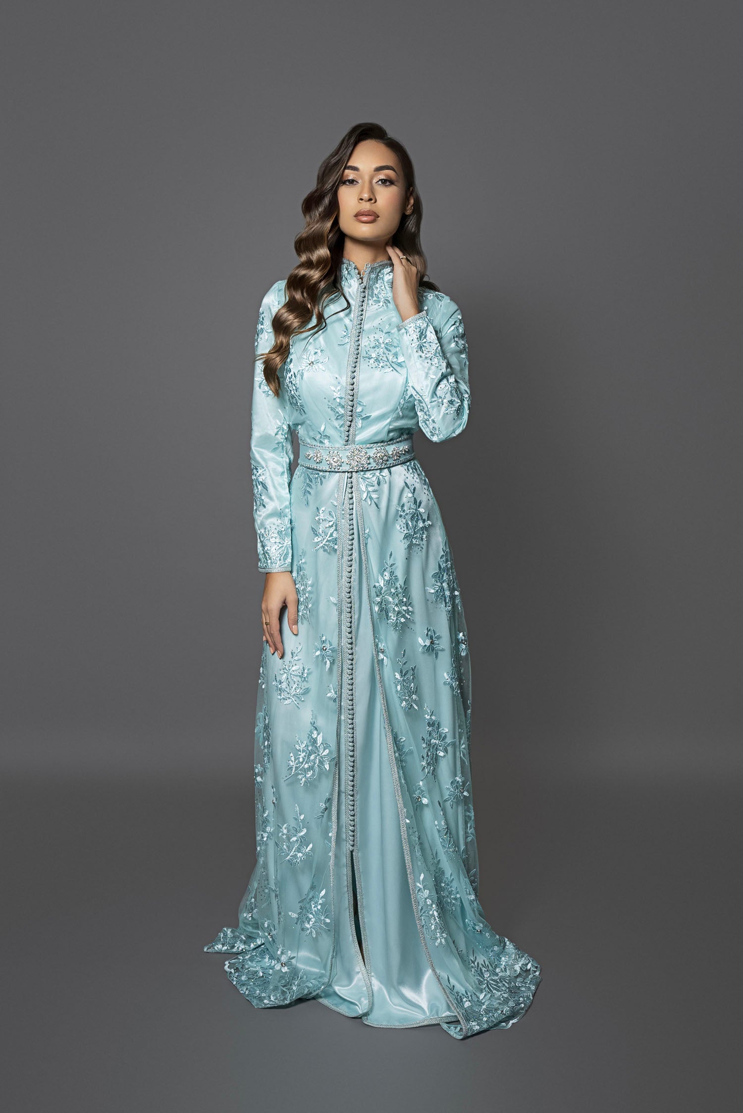 Découvrez le caftan Dakota Ice, une pièce audacieuse qui épouse parfaitement votre silhouette grâce à sa coupe ajustée et son col montant en dentelle délicate. Confectionné en satin de soie vert d'eau glacé, orné de tulle brodé, pierres et strass, il sublime votre allure avec élégance. Idéal pour porter un turban ou un hijab, ce caftan chic se complète d’une ceinture avec broche assortie. Associez-le à des escarpins et une pochette pour captiver tous les regards lors de vos soirées ou mariages. Osez l’élégance sculpturale et faites sensation.