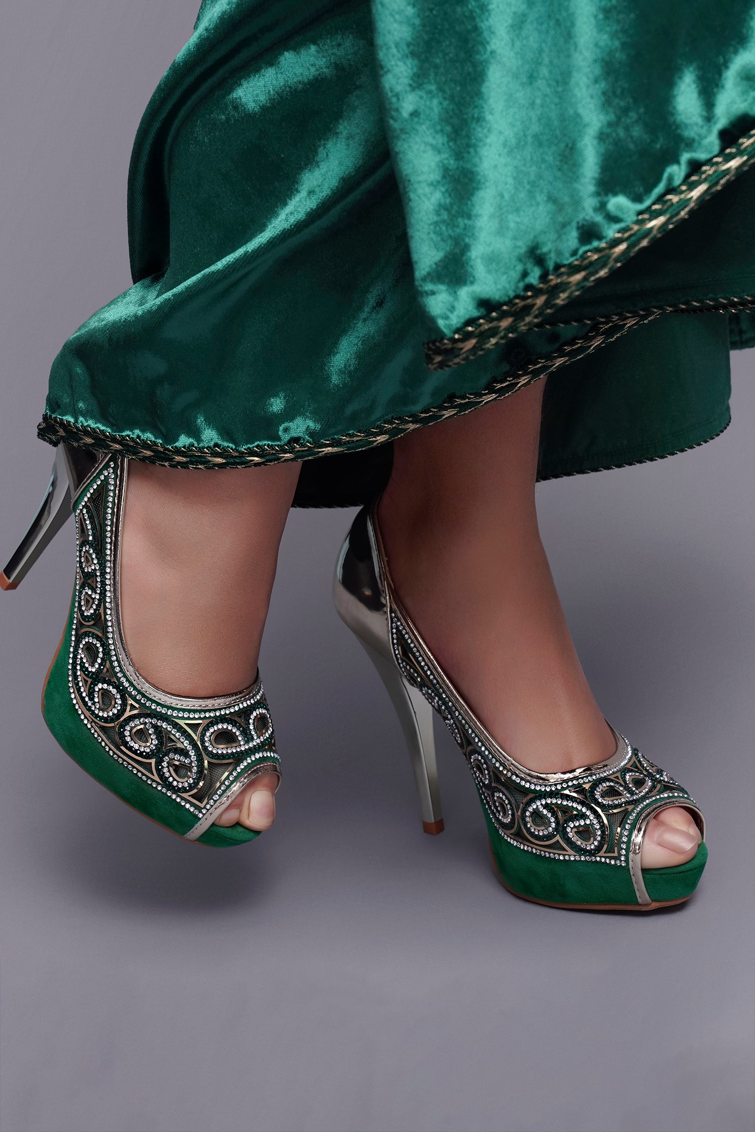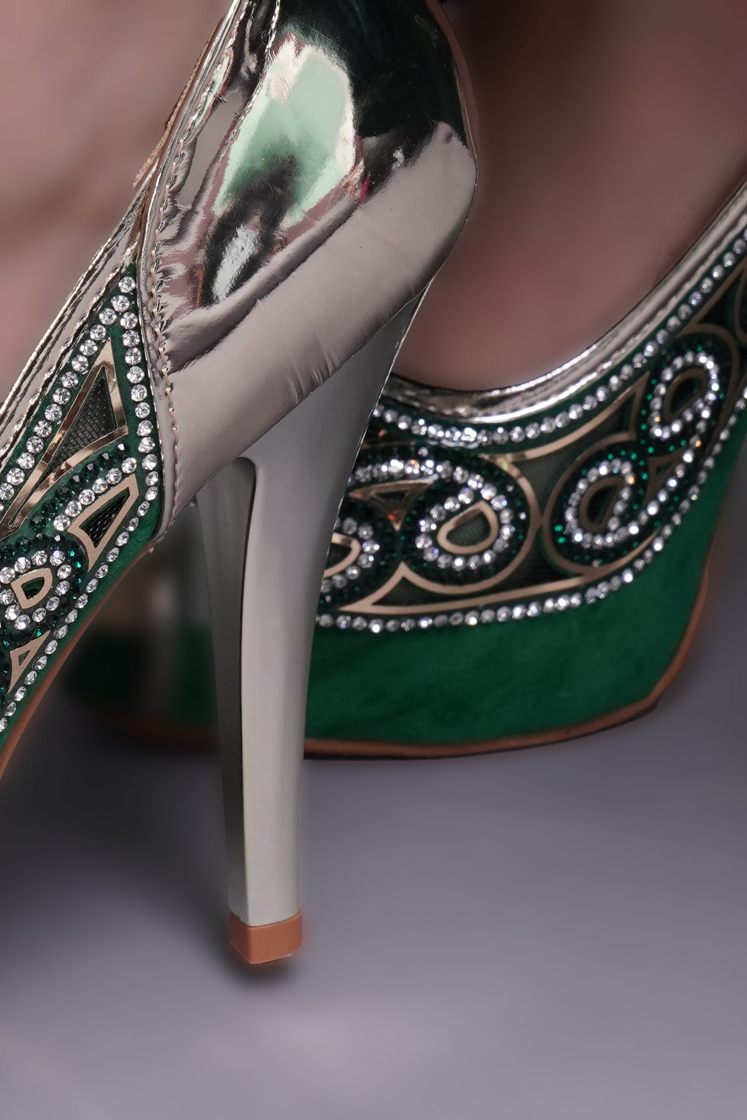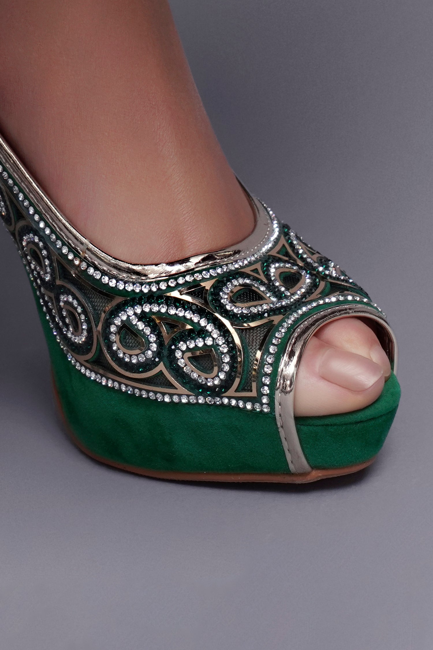 Escarpin à bout ouvert, matière type similaire velour vert royal et or. dessin ajouré avec strass
