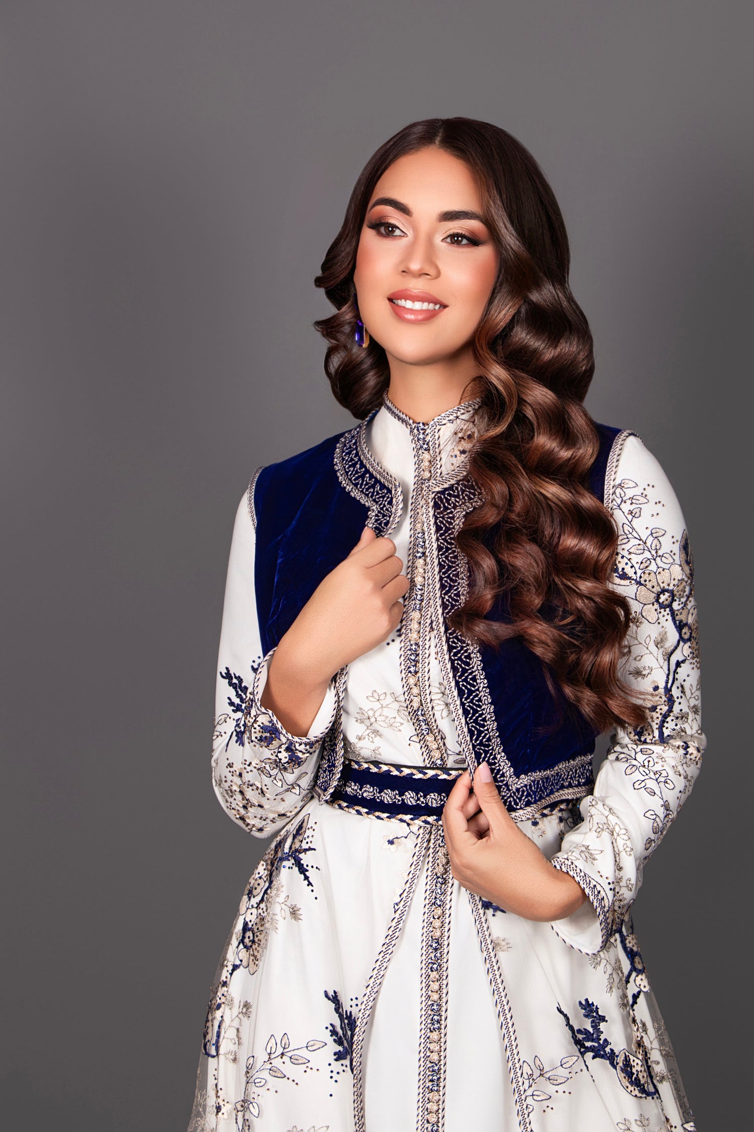 Complété par un gilet en velours bleu richement brodé et une ceinture assortie en velours brodé pour une allure raffinée et harmonieuse.